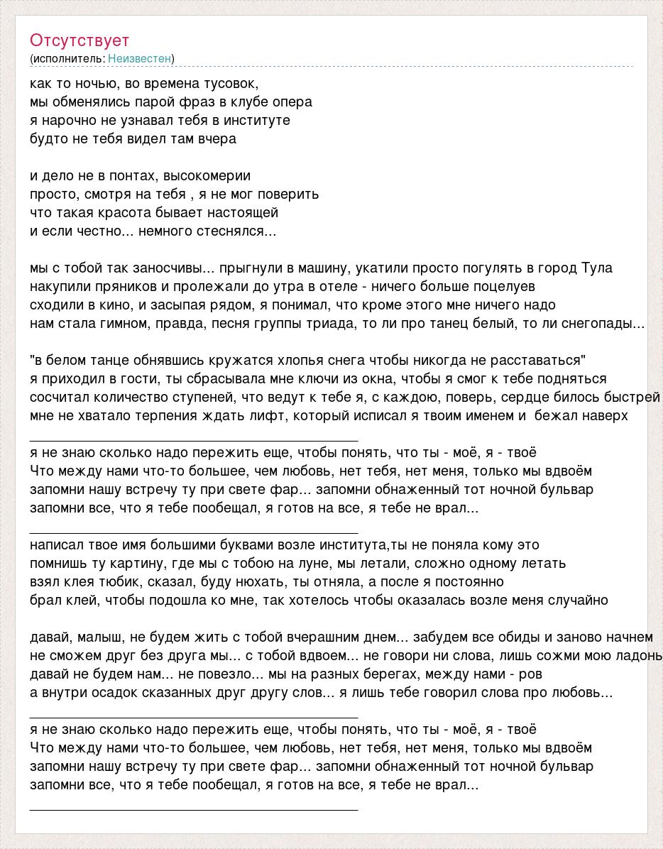 как то ночью, во времена тусовок, мы обменялись парой фраз в клубе опера я нарочно не узнавал тебя в институте будто не тебя видел там вчера и дело не в понтах, высокомерии просто, смотря на тебя , я не мог поверить что такая красота бывает настоящей и если честно... немного стеснялся... мы с тобой так заносчивы... прыгнули в машину, укатили просто погулять в город Тула накупили пряников и пролежали до утра в отеле - ничего больше поцелуев сходили в кино, и засыпая рядом, я понимал, что кроме этого мне ничего надо нам стала гимном, правда, песня группы триада, то ли про танец белый, то ли снегопады... "в белом танце обнявшись кружатся хлопья снега чтобы никогда не расставаться" я приходил в гости, ты сбрасывала мне ключи из окна, чтобы я смог к тебе подняться сосчитал количество ступеней, что ведут к тебе я, с каждою, поверь, сердце билось быстрей мне не хватало терпения ждать лифт, который исписал я твоим именем и бежал наверх __________________________________________ я не знаю сколько надо пережить еще, чтобы понять, что ты - моё, я - твоё Что между нами что-то большее, чем любовь, нет тебя, нет меня, только мы вдвоём запомни нашу встречу ту при свете фар... запомни обнаженный тот ночной бульвар запомни все, что я тебе пообещал, я готов на все, я тебе не врал... __________________________________________ написал твое имя большими буквами возле института,ты не поняла кому это помнишь ту картину, где мы с тобою на луне, мы летали, сложно одному летать взял клея тюбик, сказал, буду нюхать, ты отняла, а после я постоянно брал клей, чтобы подошла ко мне, так хотелось чтобы оказалась возле меня случайно давай, малыш, не будем жить с тобой вчерашним днем... забудем все обиды и заново начнем не сможем друг без друга мы... с тобой вдвоем... не говори ни слова, лишь сожми мою ладонь давай не будем нам... не повезло... мы на разных берегах, между нами - ров а внутри осадок сказанных друг другу слов... я лишь тебе говорил слова про любовь... __________________________________________ я не знаю сколько надо пережить еще, чтобы понять, что ты - моё, я - твоё Что между нами что-то большее, чем любовь, нет тебя, нет меня, только мы вдвоём запомни нашу встречу ту при свете фар... запомни обнаженный тот ночной бульвар запомни все, что я тебе пообещал, я готов на все, я тебе не врал... __________________________________________