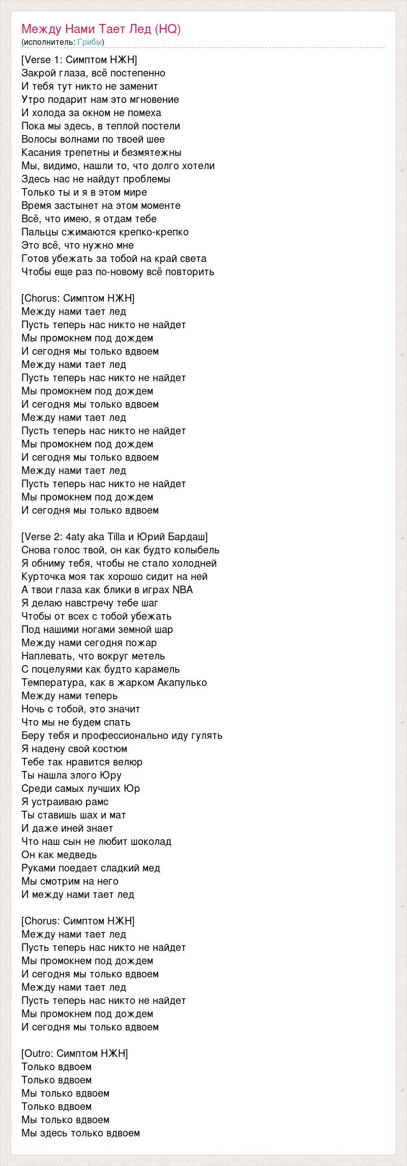 [Verse 1: Симптом НЖН] Закрой глаза, всё постепенно И тебя тут никто не заменит Утро подарит нам это мгновение И холода за окном не помеха Пока мы здесь, в теплой постели Волосы волнами по твоей шее Касания трепетны и безмятежны Мы, видимо, нашли то, что долго хотели Здесь нас не найдут проблемы Только ты и я в этом мире Время застынет на этом моменте Всё, что имею, я отдам тебе Пальцы сжимаются крепко-крепко Это всё, что нужно мне Готов убежать за тобой на край света Чтобы еще раз по-новому всё повторить [Chorus: Симптом НЖН] Между нами тает лед Пусть теперь нас никто не найдет Мы промокнем под дождем И сегодня мы только вдвоем Между нами тает лед Пусть теперь нас никто не найдет Мы промокнем под дождем И сегодня мы только вдвоем Между нами тает лед Пусть теперь нас никто не найдет Мы промокнем под дождем И сегодня мы только вдвоем Между нами тает лед Пусть теперь нас никто не найдет Мы промокнем под дождем И сегодня мы только вдвоем [Verse 2: 4aty aka Tilla и Юрий Бардаш] Снова голос твой, он как будто колыбель Я обниму тебя, чтобы не стало холодней Курточка моя так хорошо сидит на ней А твои глаза как блики в играх NBA Я делаю навстречу тебе шаг Чтобы от всех с тобой убежать Под нашими ногами земной шар Между нами сегодня пожар Наплевать, что вокруг метель С поцелуями как будто карамель Температура, как в жарком Акапулько Между нами теперь Ночь с тобой, это значит Что мы не будем спать Беру тебя и профессионально иду гулять Я надену свой костюм Тебе так нравится велюр Ты нашла злого Юру Среди самых лучших Юр Я устраиваю рамс Ты ставишь шах и мат И даже иней знает Что наш сын не любит шоколад Он как медведь Руками поедает сладкий мед Мы смотрим на него И между нами тает лед [Chorus: Симптом НЖН] Между нами тает лед Пусть теперь нас никто не найдет Мы промокнем под дождем И сегодня мы только вдвоем Между нами тает лед Пусть теперь нас никто не найдет Мы промокнем под дождем И сегодня мы только вдвоем [Outro: Симптом НЖН] Только вдвоем Только вдвоем Мы только вдвоем Только вдвоем Мы только вдвоем Мы здесь только вдвоем