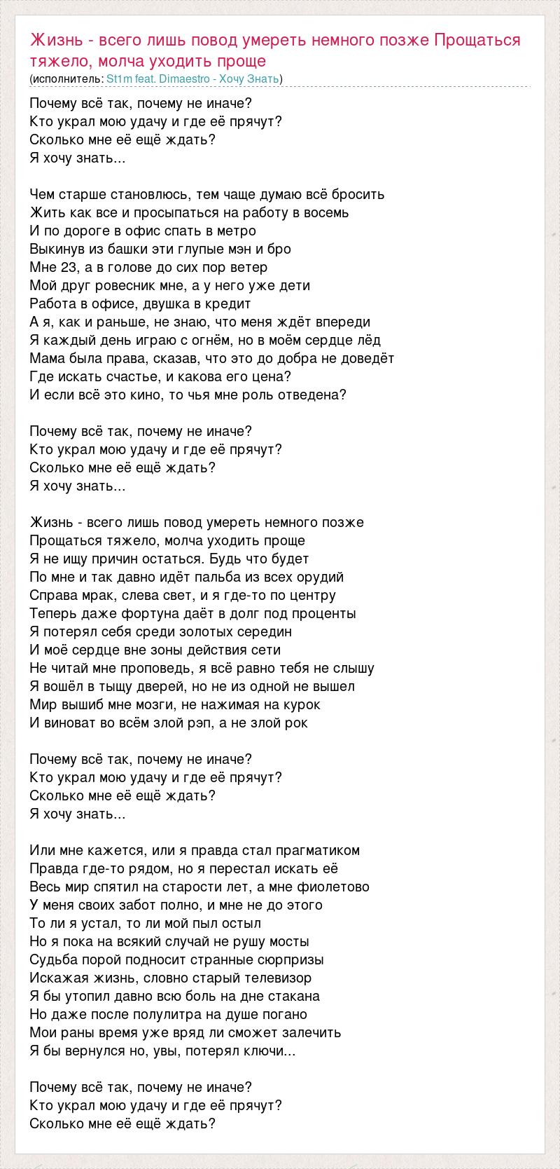 Почему всё так, почему не иначе? Кто украл мою удачу и где её прячут? Сколько мне её ещё ждать? Я хочу знать... Чем старше становлюсь, тем чаще думаю всё бросить Жить как все и просыпаться на работу в восемь И по дороге в офис спать в метро Выкинув из башки эти глупые мэн и бро Мне 23, а в голове до сих пор ветер Мой друг ровесник мне, а у него уже дети Работа в офисе, двушка в кредит А я, как и раньше, не знаю, что меня ждёт впереди Я каждый день играю с огнём, но в моём сердце лёд Мама была права, сказав, что это до добра не доведёт Где искать счастье, и какова его цена? И если всё это кино, то чья мне роль отведена? Почему всё так, почему не иначе? Кто украл мою удачу и где её прячут? Сколько мне её ещё ждать? Я хочу знать... Жизнь - всего лишь повод умереть немного позже Прощаться тяжело, молча уходить проще Я не ищу причин остаться. Будь что будет По мне и так давно идёт пальба из всех орудий Справа мрак, слева свет, и я где-то по центру Теперь даже фортуна даёт в долг под проценты Я потерял себя среди золотых середин И моё сердце вне зоны действия сети Не читай мне проповедь, я всё равно тебя не слышу Я вошёл в тыщу дверей, но не из одной не вышел Мир вышиб мне мозги, не нажимая на курок И виноват во всём злой рэп, а не злой рок Почему всё так, почему не иначе? Кто украл мою удачу и где её прячут? Сколько мне её ещё ждать? Я хочу знать... Или мне кажется, или я правда стал прагматиком Правда где-то рядом, но я перестал искать её Весь мир спятил на старости лет, а мне фиолетово У меня своих забот полно, и мне не до этого То ли я устал, то ли мой пыл остыл Но я пока на всякий случай не рушу мосты Судьба порой подносит странные сюрпризы Искажая жизнь, словно старый телевизор Я бы утопил давно всю боль на дне стакана Но даже после полулитра на душе погано Мои раны время уже вряд ли сможет залечить Я бы вернулся но, увы, потерял ключи... Почему всё так, почему не иначе? Кто украл мою удачу и где её прячут? Сколько мне её ещё ждать?