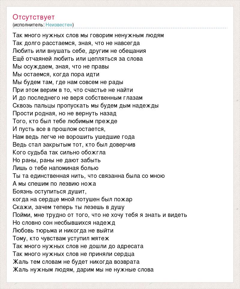 Так много нужных слов мы говорим ненужным людям Так долго расстаемся, зная, что не навсегда Любить или внушать себе, другим не обещания Ещё отчаяней любить или цепляться за слова Мы осуждаем, зная, что не правы Мы остаемся, когда пора идти Мы будем там, где нам совсем не рады При этом верим в то, что счастье не найти И до последнего не веря собственным глазам Сквозь пальцы пропускать мы будем дым надежды Прости родная, но не вернуть назад Того, кто был тебе любимым прежде И пусть все в прошлом остается, Нам ведь легче не ворошить ушедшие года Ведь стал закрытым тот, кто был доверчив Кого судьба так сильно обожгла Но раны, раны не дают забыть Лишь о тебе напоминая болью Ты та единственная нить, что связанна была со мною А мы спешим по лезвию ножа Боязнь оступиться душит, когда на сердце мной потушен был пожар Скажи, зачем теперь ты лезешь в душу Пойми, мне трудно от того, что не хочу тебя я знать и видеть Но словно сон несбывшихся надежд Любовь тюрьма и никогда не выйти Тому, кто чувствам уступил мятеж Так много нужных слов не дошли до адресата Так много нужных слов не приняли сердца Жаль тем словам не будет никогда возврата Жаль нужным людям, дарим мы не нужные слова