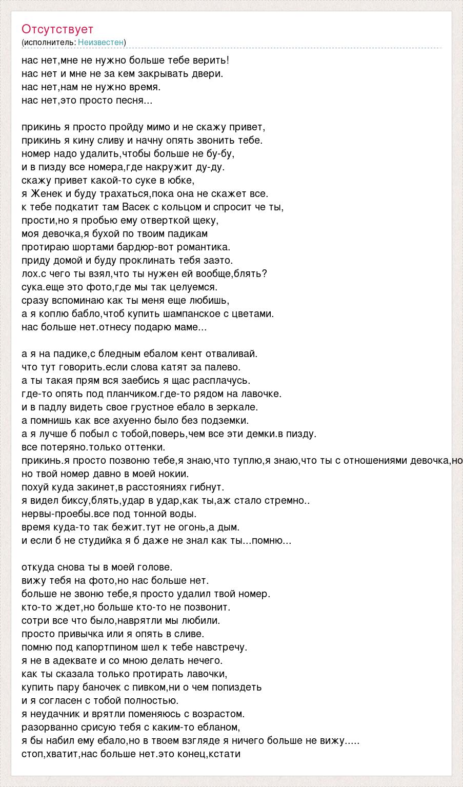 нас нет,мне не нужно больше тебе верить! нас нет и мне не за кем закрывать двери. нас нет,нам не нужно время. нас нет,это просто песня... прикинь я просто пройду мимо и не скажу привет, прикинь я кину сливу и начну опять звонить тебе. номер надо удалить,чтобы больше не бу-бу, и в пизду все номера,где накружит ду-ду. скажу привет какой-то суке в юбке, я Женек и буду трахаться,пока она не скажет все. к тебе подкатит там Васек с кольцом и спросит че ты, прости,но я пробью ему отверткой щеку, моя девочка,я бухой по твоим падикам протираю шортами бардюр-вот романтика. приду домой и буду проклинать тебя заэто. лох.с чего ты взял,что ты нужен ей вообще,блять? сука.еще это фото,где мы так целуемся. сразу вспоминаю как ты меня еще любишь, а я коплю бабло,чтоб купить шампанское с цветами. нас больше нет.отнесу подарю маме... а я на падике,с бледным ебалом кент отваливай. что тут говорить.если слова катят за палево. а ты такая прям вся заебись я щас расплачусь. где-то опять под планчиком.где-то рядом на лавочке. и в падлу видеть свое грустное ебало в зеркале. а помнишь как все ахуенно было без подземки. а я лучше б побыл с тобой,поверь,чем все эти демки.в пизду. все потеряно.только оттенки. прикинь.я просто позвоню тебе,я знаю,что туплю,я знаю,что ты с отношениями девочка,но но твой номер давно в моей нокии. похуй куда закинет,в расстояниях гибнут. я видел биксу,блять,удар в удар,как ты,аж стало стремно.. нервы-проебы.все под тонной воды. время куда-то так бежит.тут не огонь,а дым. и если б не студийка я б даже не знал как ты...помню... откуда снова ты в моей голове. вижу тебя на фото,но нас больше нет. больше не звоню тебе,я просто удалил твой номер. кто-то ждет,но больше кто-то не позвонит. сотри все что было,наврятли мы любили. просто привычка или я опять в сливе. помню под капортпином шел к тебе навстречу. я не в адеквате и со мною делать нечего. как ты сказала только протирать лавочки, купить пару баночек с пивком,ни о чем попиздеть и я согласен с тобой полностью. я неудачник и врятли поменяюсь с возрастом. разорванно срисую тебя с каким-то ебланом, я бы набил ему ебало,но в твоем взгляде я ничего больше не вижу..... стоп,хватит,нас больше нет.это конец,кстати