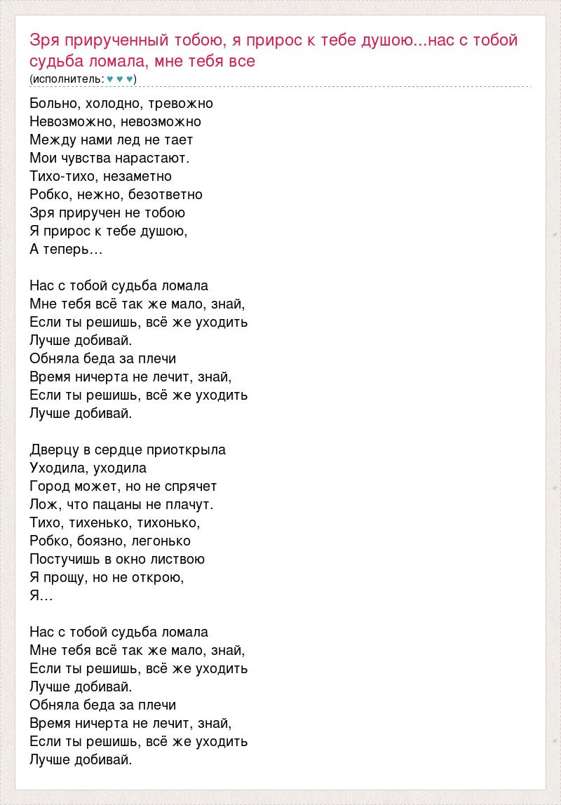 Больно, холодно, тревожно Невозможно, невозможно Между нами лед не тает Мои чувства нарастают. Тихо-тихо, незаметно Робко, нежно, безответно Зря приручен не тобою Я прирос к тебе душою, А теперь… Нас с тобой судьба ломала Мне тебя всё так же мало, знай, Если ты решишь, всё же уходить Лучше добивай. Обняла беда за плечи Время ничерта не лечит, знай, Если ты решишь, всё же уходить Лучше добивай. Дверцу в сердце приоткрыла Уходила, уходила Город может, но не спрячет Лож, что пацаны не плачут. Тихо, тихенько, тихонько, Робко, боязно, легонько Постучишь в окно листвою Я прощу, но не открою, Я… Нас с тобой судьба ломала Мне тебя всё так же мало, знай, Если ты решишь, всё же уходить Лучше добивай. Обняла беда за плечи Время ничерта не лечит, знай, Если ты решишь, всё же уходить Лучше добивай.