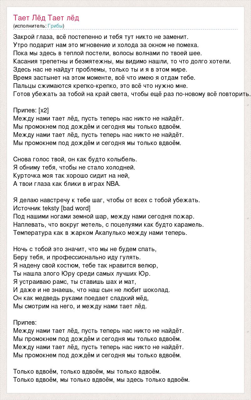 Закрой глаза, всё постепенно и тебя тут никто не заменит. Утро подарит нам это мгновение и холода за окном не помеха. Пока мы здесь в теплой постели, волосы волнами по твоей шее. Касания трепетны и безмятежны, мы видимо нашли, то что долго хотели. Здесь нас не найдут проблемы, только ты и я в этом мире. Время застынет на этом моменте, всё что имею я отдам тебе. Пальцы сжимаются крепко-крепко, это всё что нужно мне. Готов убежать за тобой на край света, чтобы ещё раз по-новому всё повторить. Припев: [x2] Между нами тает лёд, пусть теперь нас никто не найдёт. Мы промокнем под дождём и сегодня мы только вдвоём. Между нами тает лёд, пусть теперь нас никто не найдёт. Мы промокнем под дождём и сегодня мы только вдвоём. Снова голос твой, он как будто колыбель. Я обниму тебя, чтобы не стало холодней. Курточка моя так хорошо сидит на ней, А твои глаза как блики в играх NBA. Я делаю навстречу к тебе шаг, чтобы от всех с тобой убежать. Источник teksty [bad word] Под нашими ногами земной шар, между нами сегодня пожар. Наплевать, что вокруг метель, с поцелуями как будто карамель. Температура как в жарком Акапулько между нами теперь. Ночь с тобой это значит, что мы не будем спать, Беру тебя, и профессионально иду гулять. Я надену свой костюм, тебе так нравится велюр, Ты нашла злого Юру среди самых лучших Юр. Я устраиваю рамс, ты ставишь шах и мат, И даже и не знаешь, что наш сын не любит шоколад. Он как медведь руками поедает сладкий мёд, Мы смотрим на него, и между нами тает лёд. Припев: Между нами тает лёд, пусть теперь нас никто не найдёт. Мы промокнем под дождём и сегодня мы только вдвоём. Между нами тает лёд, пусть теперь нас никто не найдёт. Мы промокнем под дождём и сегодня мы только вдвоём. Только вдвоём, только вдвоём, мы только вдвоём. Только вдвоём, мы только вдвоём, мы здесь только вдвоём.