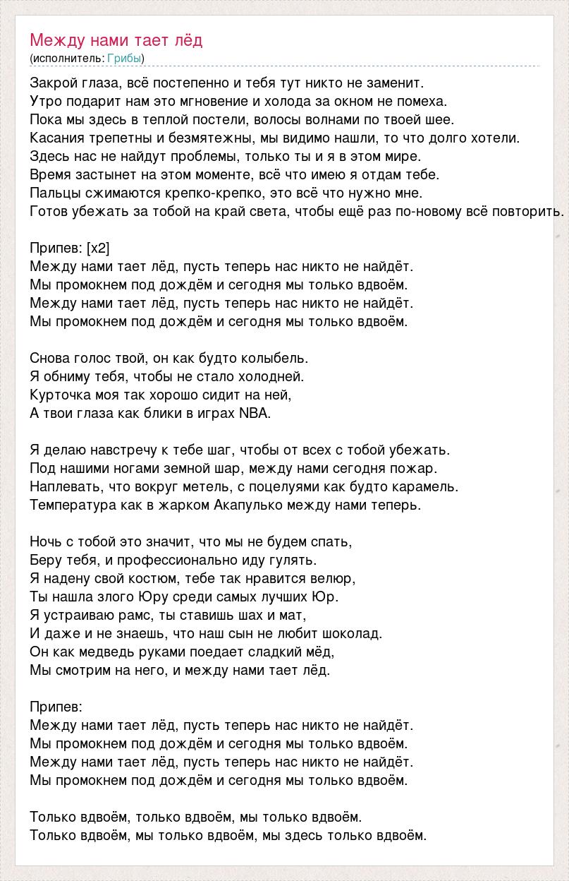 Закрой глаза, всё постепенно и тебя тут никто не заменит. Утро подарит нам это мгновение и холода за окном не помеха. Пока мы здесь в теплой постели, волосы волнами по твоей шее. Касания трепетны и безмятежны, мы видимо нашли, то что долго хотели. Здесь нас не найдут проблемы, только ты и я в этом мире. Время застынет на этом моменте, всё что имею я отдам тебе. Пальцы сжимаются крепко-крепко, это всё что нужно мне. Готов убежать за тобой на край света, чтобы ещё раз по-новому всё повторить. Припев: [x2] Между нами тает лёд, пусть теперь нас никто не найдёт. Мы промокнем под дождём и сегодня мы только вдвоём. Между нами тает лёд, пусть теперь нас никто не найдёт. Мы промокнем под дождём и сегодня мы только вдвоём. Снова голос твой, он как будто колыбель. Я обниму тебя, чтобы не стало холодней. Курточка моя так хорошо сидит на ней, А твои глаза как блики в играх NBA. Я делаю навстречу к тебе шаг, чтобы от всех с тобой убежать. Под нашими ногами земной шар, между нами сегодня пожар. Наплевать, что вокруг метель, с поцелуями как будто карамель. Температура как в жарком Акапулько между нами теперь. Ночь с тобой это значит, что мы не будем спать, Беру тебя, и профессионально иду гулять. Я надену свой костюм, тебе так нравится велюр, Ты нашла злого Юру среди самых лучших Юр. Я устраиваю рамс, ты ставишь шах и мат, И даже и не знаешь, что наш сын не любит шоколад. Он как медведь руками поедает сладкий мёд, Мы смотрим на него, и между нами тает лёд. Припев: Между нами тает лёд, пусть теперь нас никто не найдёт. Мы промокнем под дождём и сегодня мы только вдвоём. Между нами тает лёд, пусть теперь нас никто не найдёт. Мы промокнем под дождём и сегодня мы только вдвоём. Только вдвоём, только вдвоём, мы только вдвоём. Только вдвоём, мы только вдвоём, мы здесь только вдвоём.