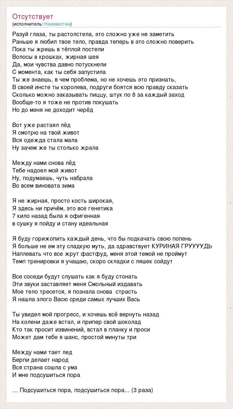 Разуй глаза, ты растолстела, это сложно уже не заметить Раньше я любил твое тело, правда теперь в это сложно поверить Пока ты жрешь в тёплой постели Волосы в крошках, жирная шея Да, мои чувства давно потускнели С момента, как ты себя запустила Ты же знаешь, в чем проблема, но не хочешь это признать, В своей инсте ты королева, подруги боятся всю правду сказать Сколько можно заказывать пиццу, штук по 8 за каждый заход Вообще-то я тоже не против покушать Но до меня не доходит черёд Вот уже растаял лёд Я смотрю на твой живот Вся одежда стала мала Ну зачем же ты столько жрала Между нами снова лёд Тебе надоел мой живот Ну, подумаешь, чуть набрала Во всем виновата зима Я не жирная, просто кость широкая, Я здесь ни причём, это все генетика 7 кило назад была я офигенная в сушку я пойду и стану идеальная Я буду горижопить каждый день, что бы подкачать свою попень Я больше не ем эту сладкую муть, да здравствует КУРИНАЯ ГРУУУУДЬ Наплевать что все жрут фастфуд, меня этой темой не проймут Темп тренировки я учащаю, скоро складки с ляшек сойдут Все соседи будут слушать как я буду стонать Эти звуки заставляет меня Смольный издавать Мое тело тресется, я познала снова страсть Я нашла злого Васю среди самых лучших Вась Ты увидел мой прогресс, и хочешь всё вернуть назад На колени даже встал, и припер свой шоколад Кто так просит извинений, встал в планку и проси Может дам тебе я шанс, простой минуты три Между нами тает лед Берпи делает народ Вся страна сошла с ума И мне подсушиться пора … Подсушиться пора, подсушиться пора... (3 раза)
