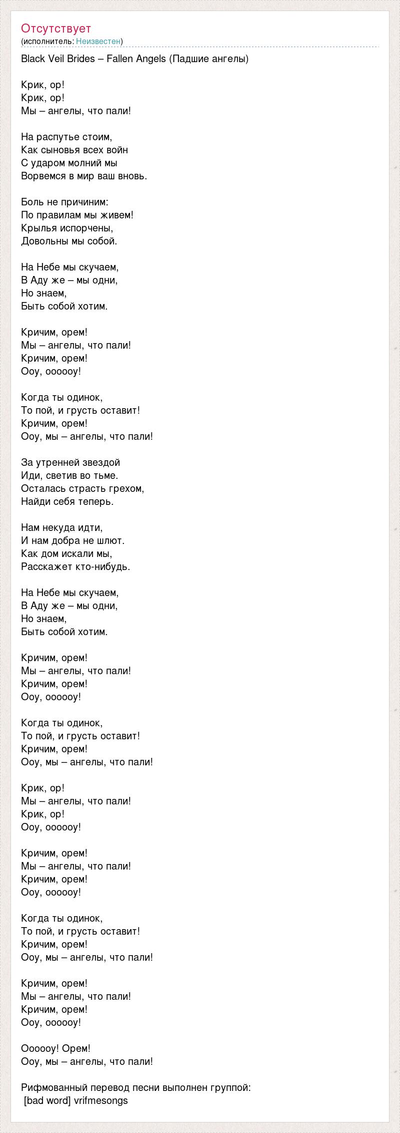 Black Veil Brides – Fallen Angels (Падшие ангелы) Крик, ор! Крик, ор! Мы – ангелы, что пали! На распутье стоим, Как сыновья всех войн С ударом молний мы Ворвемся в мир ваш вновь. Боль не причиним: По правилам мы живем! Крылья испорчены, Довольны мы собой. На Небе мы скучаем, В Аду же – мы одни, Но знаем, Быть собой хотим. Кричим, орем! Мы – ангелы, что пали! Кричим, орем! Ооу, оооооу! Когда ты одинок, То пой, и грусть оставит! Кричим, орем! Ооу, мы – ангелы, что пали! За утренней звездой Иди, светив во тьме. Осталась страсть грехом, Найди себя теперь. Нам некуда идти, И нам добра не шлют. Как дом искали мы, Расскажет кто-нибудь. На Небе мы скучаем, В Аду же – мы одни, Но знаем, Быть собой хотим. Кричим, орем! Мы – ангелы, что пали! Кричим, орем! Ооу, оооооу! Когда ты одинок, То пой, и грусть оставит! Кричим, орем! Ооу, мы – ангелы, что пали! Крик, ор! Мы – ангелы, что пали! Крик, ор! Ооу, оооооу! Кричим, орем! Мы – ангелы, что пали! Кричим, орем! Ооу, оооооу! Когда ты одинок, То пой, и грусть оставит! Кричим, орем! Ооу, мы – ангелы, что пали! Кричим, орем! Мы – ангелы, что пали! Кричим, орем! Ооу, оооооу! Оооооу! Орем! Ооу, мы – ангелы, что пали! Рифмованный перевод песни выполнен группой: [bad word] vrifmesongs