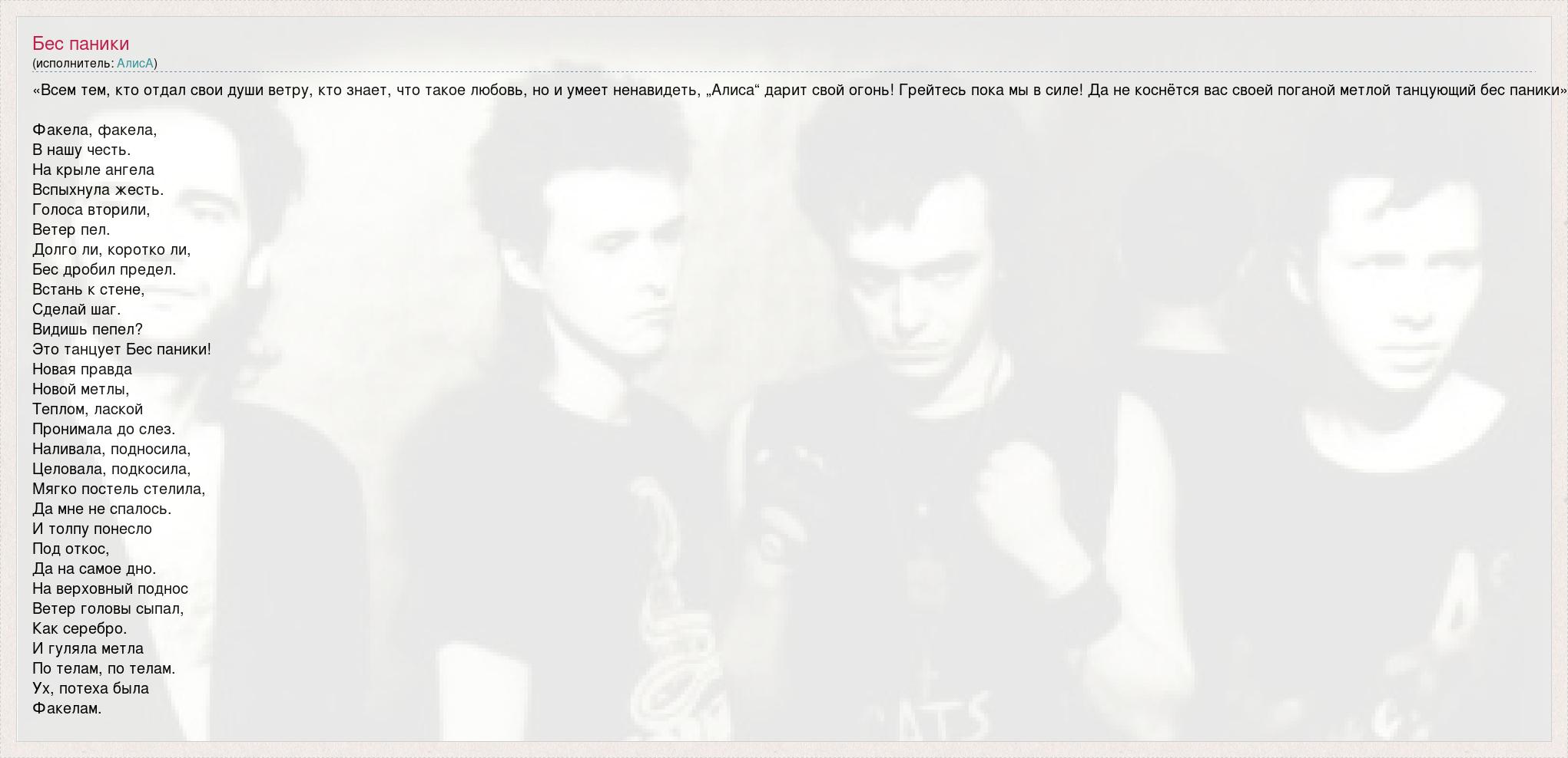 «Всем тем, кто отдал свои души ветру, кто знает, что такое любовь, но и умеет ненавидеть, „Алиса“ дарит свой огонь! Грейтесь пока мы в силе! Да не коснётся вас своей поганой метлой танцующий бес паники» Факела, факела, В нашу честь. На крыле ангела Вспыхнула жесть. Голоса вторили, Ветер пел. Долго ли, коротко ли, Бес дробил предел. Встань к стене, Сделай шаг. Видишь пепел? Это танцует Бес паники! Новая правда Новой метлы, Теплом, лаской Пронимала до слез. Наливала, подносила, Целовала, подкосила, Мягко постель стелила, Да мне не спалось. И толпу понесло Под откос, Да на самое дно. На верховный поднос Ветер головы сыпал, Как серебро. И гуляла метла По телам, по телам. Ух, потеха была Факелам.