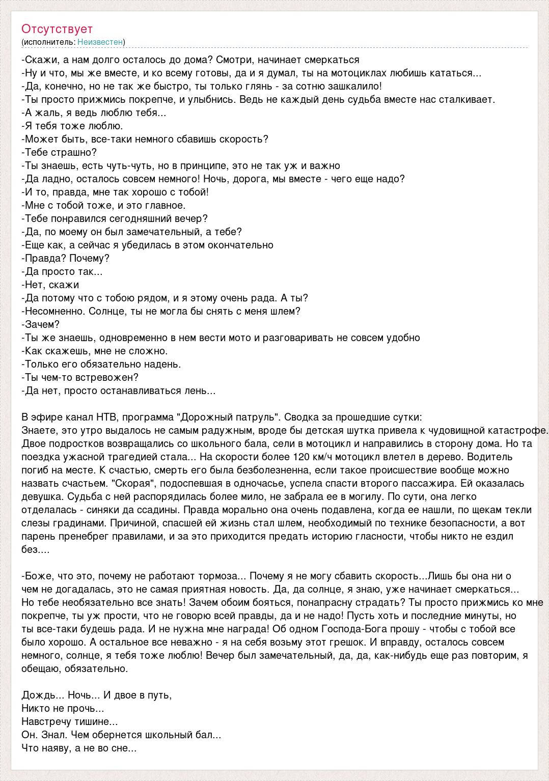 -Скажи, а нам долго осталось до дома? Смотри, начинает смеркаться -Ну и что, мы же вместе, и ко всему готовы, да и я думал, ты на мотоциклах любишь кататься... -Да, конечно, но не так же быстро, ты только глянь - за сотню зашкалило! -Ты просто прижмись покрепче, и улыбнись. Ведь не каждый день судьба вместе нас сталкивает. -А жаль, я ведь люблю тебя... -Я тебя тоже люблю. -Может быть, все-таки немного сбавишь скорость? -Тебе страшно? -Ты знаешь, есть чуть-чуть, но в принципе, это не так уж и важно -Да ладно, осталось совсем немного! Ночь, дорога, мы вместе - чего еще надо? -И то, правда, мне так хорошо с тобой! -Мне с тобой тоже, и это главное. -Тебе понравился сегодняшний вечер? -Да, по моему он был замечательный, а тебе? -Еще как, а сейчас я убедилась в этом окончательно -Правда? Почему? -Да просто так... -Нет, скажи -Да потому что с тобою рядом, и я этому очень рада. А ты? -Несомненно. Солнце, ты не могла бы снять с меня шлем? -Зачем? -Ты же знаешь, одновременно в нем вести мото и разговаривать не совсем удобно -Как скажешь, мне не сложно. -Только его обязательно надень. -Ты чем-то встревожен? -Да нет, просто останавливаться лень... В эфире канал НТВ, программа "Дорожный патруль". Сводка за прошедшие сутки: Знаете, это утро выдалось не самым радужным, вроде бы детская шутка привела к чудовищной катастрофе. Двое подростков возвращались со школьного бала, сели в мотоцикл и направились в сторону дома. Но та поездка ужасной трагедией стала... На скорости более 120 км/ч мотоцикл влетел в дерево. Водитель погиб на месте. К счастью, смерть его была безболезненна, если такое происшествие вообще можно назвать счастьем. "Скорая", подоспевшая в одночасье, успела спасти второго пассажира. Ей оказалась девушка. Судьба с ней распорядилась более мило, не забрала ее в могилу. По сути, она легко отделалась - синяки да ссадины. Правда морально она очень подавлена, когда ее нашли, по щекам текли слезы градинами. Причиной, спасшей ей жизнь стал шлем, необходимый по технике безопасности, а вот парень пренебрег правилами, и за это приходится предать историю гласности, чтобы никто не ездил без.... -Боже, что это, почему не работают тормоза... Почему я не могу сбавить скорость...Лишь бы она ни о чем не догадалась, это не самая приятная новость. Да, да солнце, я знаю, уже начинает смеркаться... Но тебе необязательно все знать! Зачем обоим бояться, понапрасну страдать? Ты просто прижмись ко мне покрепче, ты уж прости, что не говорю всей правды, да и не надо! Пусть хоть и последние минуты, но ты все-таки будешь рада. И не нужна мне награда! Об одном Господа-Бога прошу - чтобы с тобой все было хорошо. А остальное все неважно - я на себя возьму этот грешок. И вправду, осталось совсем немного, солнце, я тебя тоже люблю! Вечер был замечательный, да, да, как-нибудь еще раз повторим, я обещаю, обязательно. Дождь... Ночь... И двое в путь, Никто не прочь... Навстречу тишине... Он. Знал. Чем обернется школьный бал... Что наяву, а не во сне...