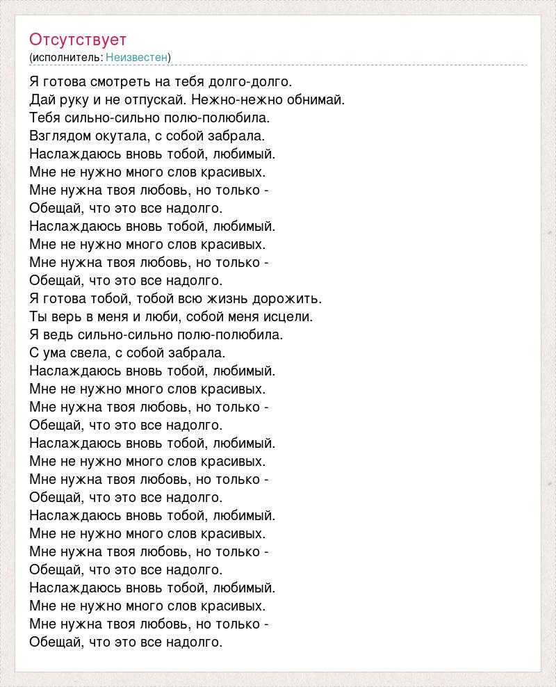 Я готова смотреть на тебя долго-долго. Дай руку и не отпускай. Нежно-нежно обнимай. Тебя сильно-сильно полю-полюбила. Взглядом окутала, с собой забрала. Наслаждаюсь вновь тобой, любимый. Мне не нужно много слов красивых. Мне нужна твоя любовь, но только - Обещай, что это все надолго. Наслаждаюсь вновь тобой, любимый. Мне не нужно много слов красивых. Мне нужна твоя любовь, но только - Обещай, что это все надолго. Я готова тобой, тобой всю жизнь дорожить. Ты верь в меня и люби, собой меня исцели. Я ведь сильно-сильно полю-полюбила. С ума свела, с собой забрала. Наслаждаюсь вновь тобой, любимый. Мне не нужно много слов красивых. Мне нужна твоя любовь, но только - Обещай, что это все надолго. Наслаждаюсь вновь тобой, любимый. Мне не нужно много слов красивых. Мне нужна твоя любовь, но только - Обещай, что это все надолго. Наслаждаюсь вновь тобой, любимый. Мне не нужно много слов красивых. Мне нужна твоя любовь, но только - Обещай, что это все надолго. Наслаждаюсь вновь тобой, любимый. Мне не нужно много слов красивых. Мне нужна твоя любовь, но только - Обещай, что это все надолго.