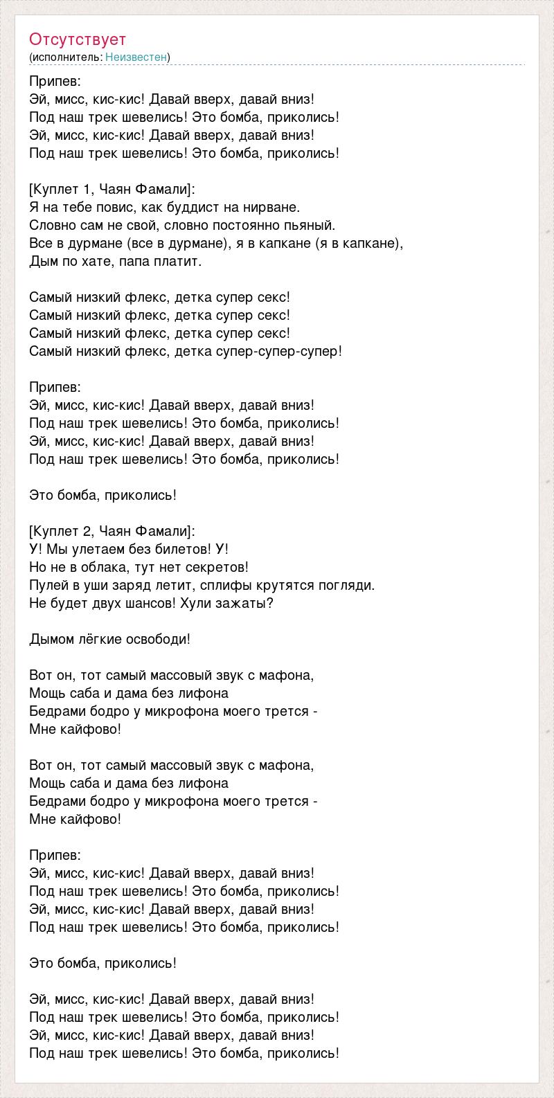 Припев: Эй, мисс, кис-кис! Давай вверх, давай вниз! Под наш трек шевелись! Это бомба, приколись! Эй, мисс, кис-кис! Давай вверх, давай вниз! Под наш трек шевелись! Это бомба, приколись! [Куплет 1, Чаян Фамали]: Я на тебе повис, как буддист на нирване. Словно сам не свой, словно постоянно пьяный. Все в дурмане (все в дурмане), я в капкане (я в капкане), Дым по хате, папа платит. Самый низкий флекс, детка супер секс! Самый низкий флекс, детка супер секс! Самый низкий флекс, детка супер секс! Самый низкий флекс, детка супер-супер-супер! Припев: Эй, мисс, кис-кис! Давай вверх, давай вниз! Под наш трек шевелись! Это бомба, приколись! Эй, мисс, кис-кис! Давай вверх, давай вниз! Под наш трек шевелись! Это бомба, приколись! Это бомба, приколись! [Куплет 2, Чаян Фамали]: У! Мы улетаем без билетов! У! Но не в облака, тут нет секретов! Пулей в уши заряд летит, сплифы крутятся погляди. Не будет двух шансов! Хули зажаты? Дымом лёгкие освободи! Вот он, тот самый массовый звук с мафона, Мощь саба и дама без лифона Бедрами бодро у микрофона моего трется - Мне кайфово! Вот он, тот самый массовый звук с мафона, Мощь саба и дама без лифона Бедрами бодро у микрофона моего трется - Мне кайфово! Припев: Эй, мисс, кис-кис! Давай вверх, давай вниз! Под наш трек шевелись! Это бомба, приколись! Эй, мисс, кис-кис! Давай вверх, давай вниз! Под наш трек шевелись! Это бомба, приколись! Это бомба, приколись! Эй, мисс, кис-кис! Давай вверх, давай вниз! Под наш трек шевелись! Это бомба, приколись! Эй, мисс, кис-кис! Давай вверх, давай вниз! Под наш трек шевелись! Это бомба, приколись!