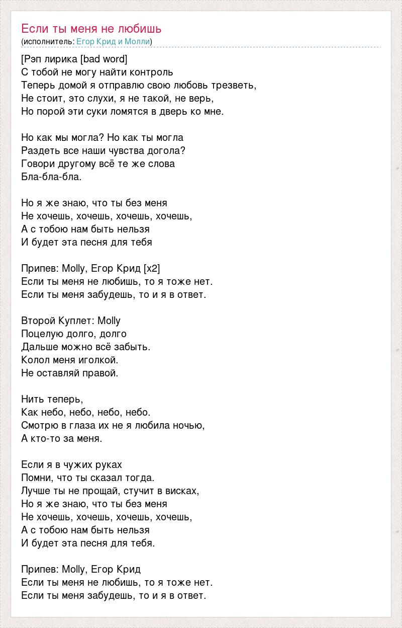 [Рэп лирика [bad word] С тобой не могу найти контроль Теперь домой я отправлю свою любовь трезветь, Не стоит, это слухи, я не такой, не верь, Но порой эти суки ломятся в дверь ко мне. Но как мы могла? Но как ты могла Раздеть все наши чувства догола? Говори другому всё те же слова Бла-бла-бла. Но я же знаю, что ты без меня Не хочешь, хочешь, хочешь, хочешь, А с тобою нам быть нельзя И будет эта песня для тебя Припев: Molly, Егор Крид [x2] Если ты меня не любишь, то я тоже нет. Если ты меня забудешь, то и я в ответ. Второй Куплет: Molly Поцелую долго, долго Дальше можно всё забыть. Колол меня иголкой. Не оставляй правой. Нить теперь, Как небо, небо, небо, небо. Смотрю в глаза их не я любила ночью, А кто-то за меня. Если я в чужих руках Помни, что ты сказал тогда. Лучше ты не прощай, стучит в висках, Но я же знаю, что ты без меня Не хочешь, хочешь, хочешь, хочешь, А с тобою нам быть нельзя И будет эта песня для тебя. Припев: Molly, Егор Крид Если ты меня не любишь, то я тоже нет. Если ты меня забудешь, то и я в ответ.