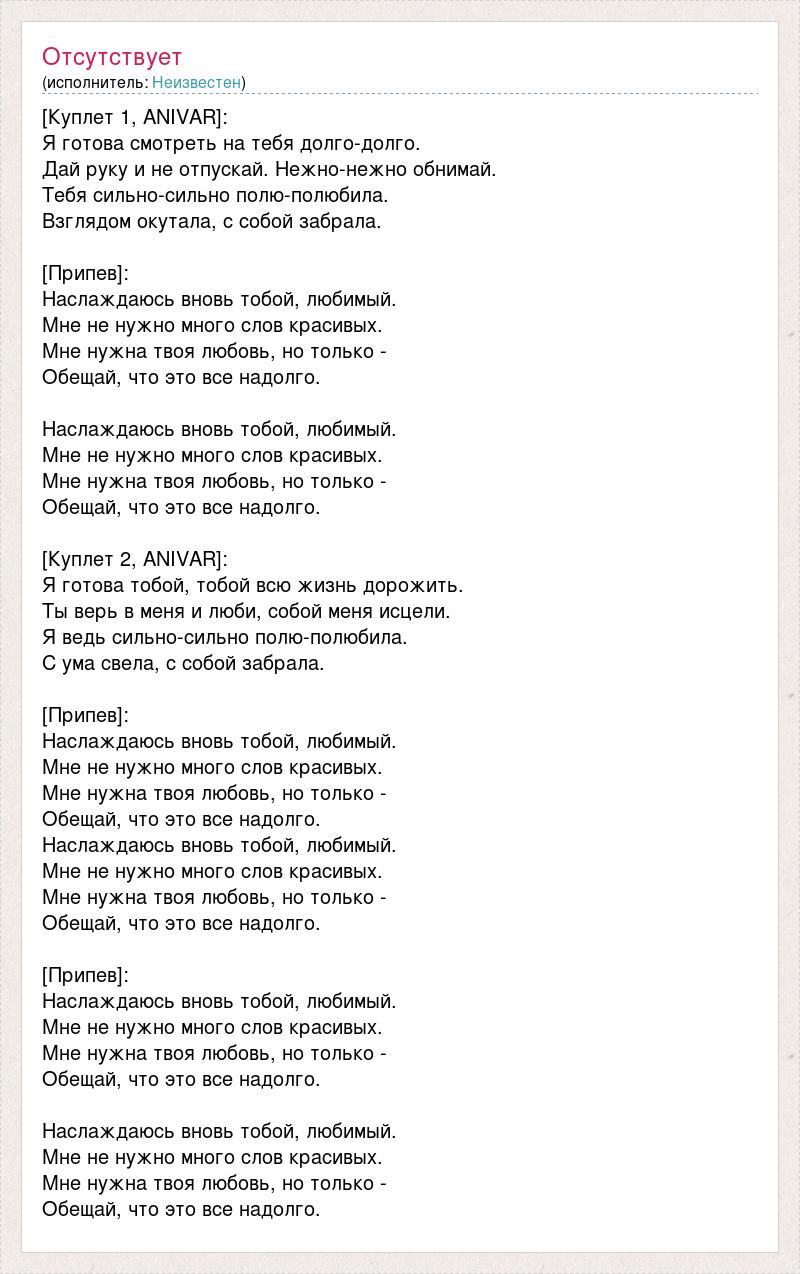[Куплет 1, ANIVAR]: Я готова смотреть на тебя долго-долго. Дай руку и не отпускай. Нежно-нежно обнимай. Тебя сильно-сильно полю-полюбила. Взглядом окутала, с собой забрала. [Припев]: Наслаждаюсь вновь тобой, любимый. Мне не нужно много слов красивых. Мне нужна твоя любовь, но только - Обещай, что это все надолго. Наслаждаюсь вновь тобой, любимый. Мне не нужно много слов красивых. Мне нужна твоя любовь, но только - Обещай, что это все надолго. [Куплет 2, ANIVAR]: Я готова тобой, тобой всю жизнь дорожить. Ты верь в меня и люби, собой меня исцели. Я ведь сильно-сильно полю-полюбила. С ума свела, с собой забрала. [Припев]: Наслаждаюсь вновь тобой, любимый. Мне не нужно много слов красивых. Мне нужна твоя любовь, но только - Обещай, что это все надолго. Наслаждаюсь вновь тобой, любимый. Мне не нужно много слов красивых. Мне нужна твоя любовь, но только - Обещай, что это все надолго. [Припев]: Наслаждаюсь вновь тобой, любимый. Мне не нужно много слов красивых. Мне нужна твоя любовь, но только - Обещай, что это все надолго. Наслаждаюсь вновь тобой, любимый. Мне не нужно много слов красивых. Мне нужна твоя любовь, но только - Обещай, что это все надолго.
