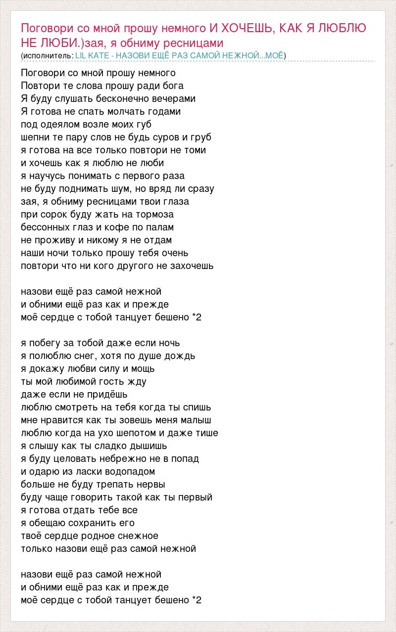 Поговори со мной прошу немного Повтори те слова прошу ради бога Я буду слушать бесконечно вечерами Я готова не спать молчать годами под одеялом возле моих губ шепни те пару слов не будь суров и груб я готова на все только повтори не томи и хочешь как я люблю не люби я научусь понимать с первого раза не буду поднимать шум, но вряд ли сразу зая, я обниму ресницами твои глаза при сорок буду жать на тормоза бессонных глаз и кофе по палам не проживу и никому я не отдам наши ночи только прошу тебя очень повтори что ни кого другого не захочешь назови ещё раз самой нежной и обними ещё раз как и прежде моё сердце с тобой танцует бешено *2 я побегу за тобой даже если ночь я полюблю снег, хотя по душе дождь я докажу любви силу и мощь ты мой любимой гость жду даже если не придёшь люблю смотреть на тебя когда ты спишь мне нравится как ты зовешь меня малыш люблю когда на ухо шепотом и даже тише я слышу как ты сладко дышишь я буду целовать небрежно не в попад и одарю из ласки водопадом больше не буду трепать нервы буду чаще говорить такой как ты первый я готова отдать тебе все я обещаю сохранить его твоё сердце родное снежное только назови ещё раз самой нежной назови ещё раз самой нежной и обними ещё раз как и прежде моё сердце с тобой танцует бешено *2
