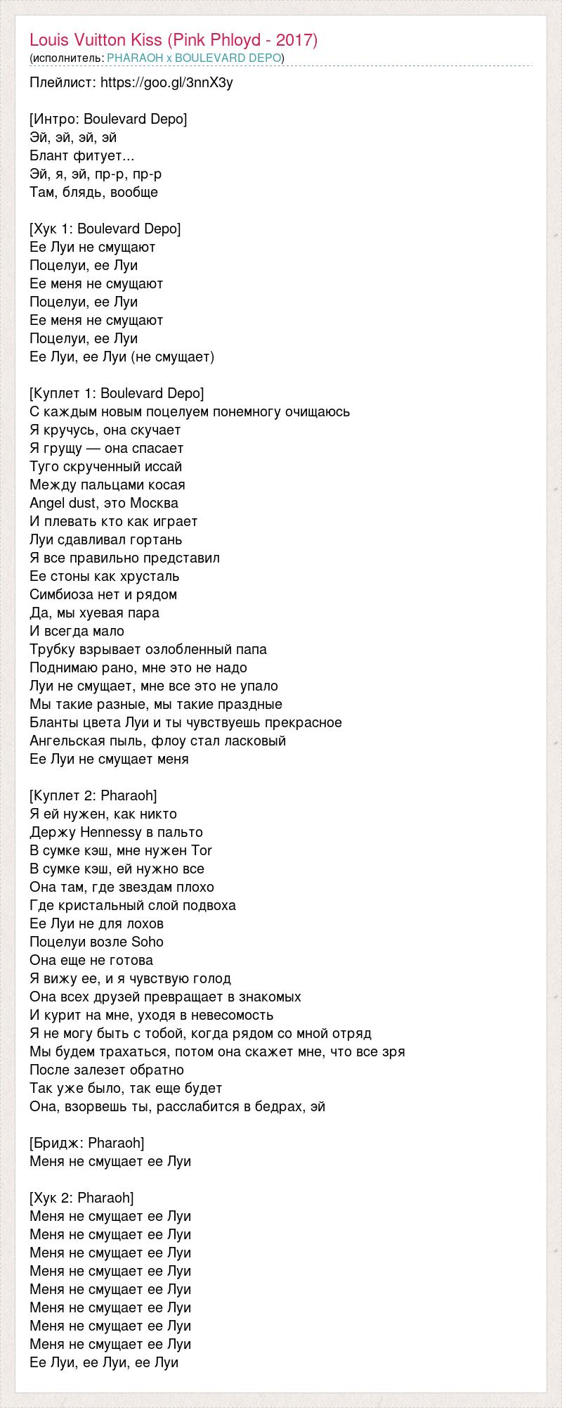 Плейлист: https://goo.gl/3nnX3y [Интро: Boulevard Depo] Эй, эй, эй, эй Блант фитует... Эй, я, эй, пр-р, пр-р Там, блядь, вообще [Хук 1: Boulevard Depo] Ее Луи не смущают Поцелуи, ее Луи Ее меня не смущают Поцелуи, ее Луи Ее меня не смущают Поцелуи, ее Луи Ее Луи, ее Луи (не смущает) [Куплет 1: Boulevard Depo] С каждым новым поцелуем понемногу очищаюсь Я кручусь, она скучает Я грущу — она спасает Туго скрученный иссай Между пальцами косая Angel dust, это Москва И плевать кто как играет Луи сдавливал гортань Я все правильно представил Ее стоны как хрусталь Симбиоза нет и рядом Да, мы хуевая пара И всегда мало Трубку взрывает озлобленный папа Поднимаю рано, мне это не надо Луи не смущает, мне все это не упало Мы такие разные, мы такие праздные Бланты цвета Луи и ты чувствуешь прекрасное Ангельская пыль, флоу стал ласковый Ее Луи не смущает меня [Куплет 2: Pharaoh] Я ей нужен, как никто Держу Hennessy в пальто В сумке кэш, мне нужен Tor В сумке кэш, ей нужно все Она там, где звездам плохо Где кристальный слой подвоха Ее Луи не для лохов Поцелуи возле Soho Она еще не готова Я вижу ее, и я чувствую голод Она всех друзей превращает в знакомых И курит на мне, уходя в невесомость Я не могу быть с тобой, когда рядом со мной отряд Мы будем трахаться, потом она скажет мне, что все зря После залезет обратно Так уже было, так еще будет Она, взорвешь ты, расслабится в бедрах, эй [Бридж: Pharaoh] Меня не смущает ее Луи [Хук 2: Pharaoh] Меня не смущает ее Луи Меня не смущает ее Луи Меня не смущает ее Луи Меня не смущает ее Луи Меня не смущает ее Луи Меня не смущает ее Луи Меня не смущает ее Луи Меня не смущает ее Луи Ее Луи, ее Луи, ее Луи