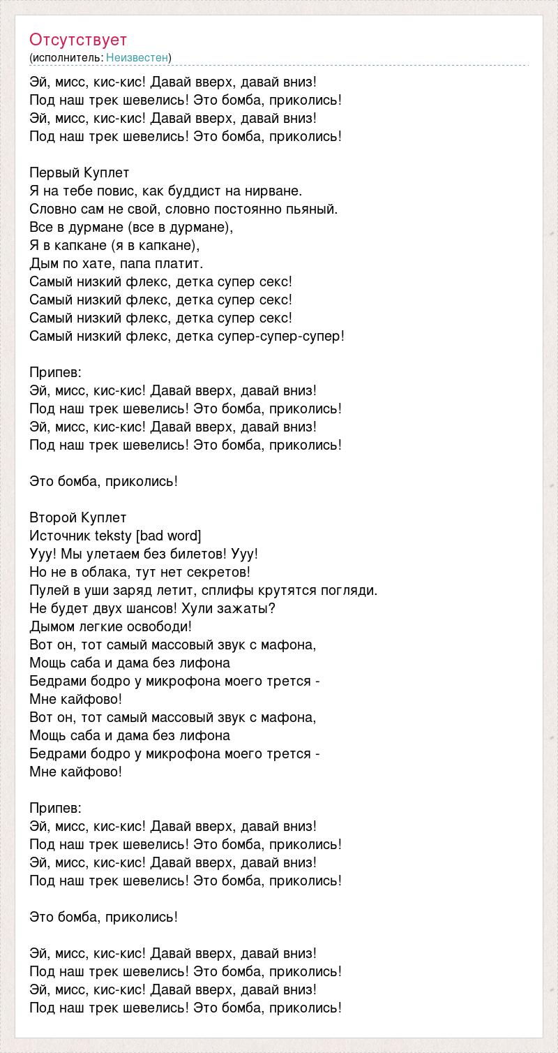 Эй, мисс, кис-кис! Давай вверх, давай вниз! Под наш трек шевелись! Это бомба, приколись! Эй, мисс, кис-кис! Давай вверх, давай вниз! Под наш трек шевелись! Это бомба, приколись! Первый Куплет Я на тебе повис, как буддист на нирване. Словно сам не свой, словно постоянно пьяный. Все в дурмане (все в дурмане), Я в капкане (я в капкане), Дым по хате, папа платит. Самый низкий флекс, детка супер секс! Самый низкий флекс, детка супер секс! Самый низкий флекс, детка супер секс! Самый низкий флекс, детка супер-супер-супер! Припев: Эй, мисс, кис-кис! Давай вверх, давай вниз! Под наш трек шевелись! Это бомба, приколись! Эй, мисс, кис-кис! Давай вверх, давай вниз! Под наш трек шевелись! Это бомба, приколись! Это бомба, приколись! Второй Куплет Источник teksty [bad word] Ууу! Мы улетаем без билетов! Ууу! Но не в облака, тут нет секретов! Пулей в уши заряд летит, сплифы крутятся погляди. Не будет двух шансов! Хули зажаты? Дымом легкие освободи! Вот он, тот самый массовый звук с мафона, Мощь саба и дама без лифона Бедрами бодро у микрофона моего трется - Мне кайфово! Вот он, тот самый массовый звук с мафона, Мощь саба и дама без лифона Бедрами бодро у микрофона моего трется - Мне кайфово! Припев: Эй, мисс, кис-кис! Давай вверх, давай вниз! Под наш трек шевелись! Это бомба, приколись! Эй, мисс, кис-кис! Давай вверх, давай вниз! Под наш трек шевелись! Это бомба, приколись! Это бомба, приколись! Эй, мисс, кис-кис! Давай вверх, давай вниз! Под наш трек шевелись! Это бомба, приколись! Эй, мисс, кис-кис! Давай вверх, давай вниз! Под наш трек шевелись! Это бомба, приколись!