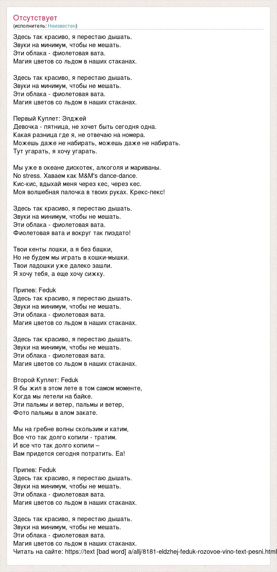 Здесь так красиво, я перестаю дышать. Звуки на минимум, чтобы не мешать. Эти облака - фиолетовая вата. Магия цветов со льдом в наших стаканах. Здесь так красиво, я перестаю дышать. Звуки на минимум, чтобы не мешать. Эти облака - фиолетовая вата. Магия цветов со льдом в наших стаканах. Первый Куплет: Элджей Девочка - пятница, не хочет быть сегодня одна. Какая разница где я, не отвечаю на номера. Можешь даже не набирать, можешь даже не набирать. Тут угарать, я хочу угарать. Мы уже в океане дискотек, алкоголя и мариваны. No stress. Хаваем как M&M's dance-dance. Кис-кис, вдыхай меня через кес, через кес. Моя волшебная палочка в твоих руках. Крекс-пекс! Здесь так красиво, я перестаю дышать. Звуки на минимум, чтобы не мешать. Эти облака - фиолетовая вата. Фиолетовая вата и вокруг так пиздато! Твои кенты лошки, а я без башки, Но не будем мы играть в кошки-мышки. Твои ладошки уже далеко зашли. Я хочу тебя, а еще хочу сижку. Припев: Feduk Здесь так красиво, я перестаю дышать. Звуки на минимум, чтобы не мешать. Эти облака - фиолетовая вата. Магия цветов со льдом в наших стаканах. Здесь так красиво, я перестаю дышать. Звуки на минимум, чтобы не мешать. Эти облака - фиолетовая вата. Магия цветов со льдом в наших стаканах. Второй Куплет: Feduk Я бы жил в этом лете в том самом моменте, Когда мы летели на байке. Эти пальмы и ветер, пальмы и ветер, Фото пальмы в алом закате. Мы на гребне волны скользим и катим, Все что так долго копили - тратим. И все что так долго копили – Вам придется сегодня потратить. Еа! Припев: Feduk Здесь так красиво, я перестаю дышать. Звуки на минимум, чтобы не мешать. Эти облака - фиолетовая вата. Магия цветов со льдом в наших стаканах. Здесь так красиво, я перестаю дышать. Звуки на минимум, чтобы не мешать. Эти облака - фиолетовая вата. Магия цветов со льдом в наших стаканах. Читать на сайте: https://text [bad word] a/allj/8181-eldzhej-feduk-rozovoe-vino-text-pesni.html
