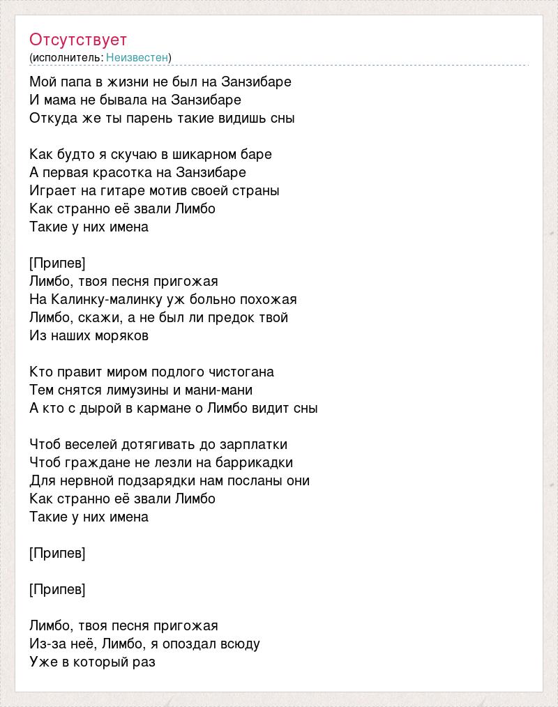 Мой папа в жизни не был на Занзибаре И мама не бывала на Занзибаре Откуда же ты парень такие видишь сны Как будто я скучаю в шикарном баре А первая красотка на Занзибаре Играет на гитаре мотив своей страны Как странно её звали Лимбо Такие у них имена [Припев] Лимбо, твоя песня пригожая На Калинку-малинку уж больно похожая Лимбо, скажи, а не был ли предок твой Из наших моряков Кто правит миром подлого чистогана Тем снятся лимузины и мани-мани А кто с дырой в кармане о Лимбо видит сны Чтоб веселей дотягивать до зарплатки Чтоб граждане не лезли на баррикадки Для нервной подзарядки нам посланы они Как странно её звали Лимбо Такие у них имена [Припев] [Припев] Лимбо, твоя песня пригожая Из-за неё, Лимбо, я опоздал всюду Уже в который раз