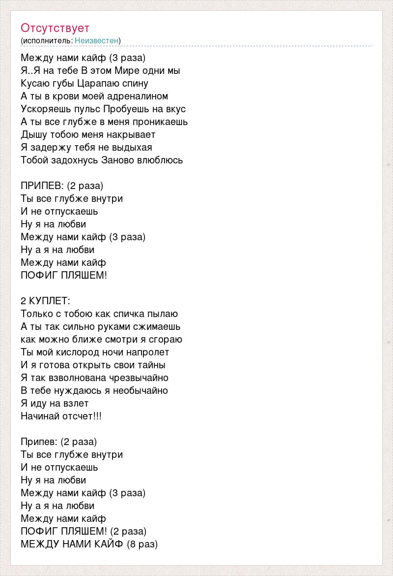 Между нами кайф (3 раза) Я..Я на тебе В этом Мире одни мы Кусаю губы Царапаю спину А ты в крови моей адреналином Ускоряешь пульс Пробуешь на вкус А ты все глубже в меня проникаешь Дышу тобою меня накрывает Я задержу тебя не выдыхая Тобой задохнусь Заново влюблюсь ПРИПЕВ: (2 раза) Ты все глубже внутри И не отпускаешь Ну я на любви Между нами кайф (3 раза) Ну а я на любви Между нами кайф ПОФИГ ПЛЯШЕМ! 2 КУПЛЕТ: Только с тобою как спичка пылаю А ты так сильно руками сжимаешь как можно ближе смотри я сгораю Ты мой кислород ночи напролет И я готова открыть свои тайны Я так взволнована чрезвычайно В тебе нуждаюсь я необычайно Я иду на взлет Начинай отсчет!!! Припев: (2 раза) Ты все глубже внутри И не отпускаешь Ну я на любви Между нами кайф (3 раза) Ну а я на любви Между нами кайф ПОФИГ ПЛЯШЕМ! (2 раза) МЕЖДУ НАМИ КАЙФ (8 раз)