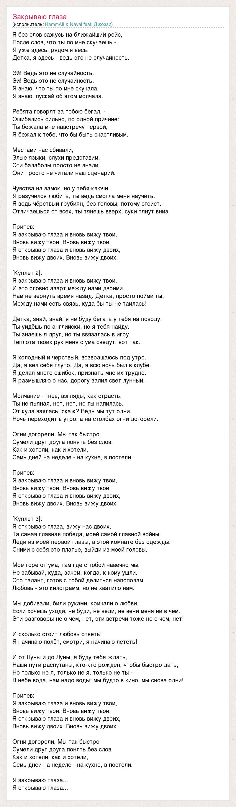 Я без слов сажусь на ближайший рейс, После слов, что ты по мне скучаешь - Я уже здесь, рядом я весь. Детка, я здесь - ведь это не случайность. Эй! Ведь это не случайность. Эй! Ведь это не случайность. Я знаю, что ты по мне скучала, Я знаю, пускай об этом молчала. Ребята говорят за тобою бегал, - Ошибались сильно, по одной причине: Ты бежала мне навстречу первой, Я бежал к тебе, что бы быть счастливым. Местами нас сбивали, Злые языки, слухи представим, Эти балаболы просто не знали. Они просто не читали наш сценарий. Чувства на замок, но у тебя ключи. Я разучился любить, ты ведь смогла меня научить. Я ведь чёрствый грубиян, без головы, потому эгоист. Отличаешься от всех, ты тянешь вверх, суки тянут вниз. Припев: Я закрываю глаза и вновь вижу твои, Вновь вижу твои. Вновь вижу твои. Я открываю глаза и вновь вижу двоих, Вновь вижу двоих. Вновь вижу двоих. [Куплет 2]: Я закрываю глаза и вновь вижу твои, И это словно азарт между нами двоими. Нам не вернуть время назад. Детка, просто пойми ты, Между нами есть связь, куда бы ты не таилась! Детка, знай, знай: я не буду бегать у тебя на поводу. Ты уйдёшь по английски, но я тебя найду. Ты знаешь я друг, но ты ввязалась в игру, Теплота твоих рук меня с ума сведут, вот так. Я холодный и черствый, возвращаюсь под утро. Да, я вёл себя глупо. Да, я всю ночь был в клубе. Я делал много ошибок, признать мне их трудно. Я размышляю о нас, дорогу залил свет лунный. Молчание - гнев; взгляды, как страсть. Ты не пьяная, нет, нет, но ты напилась. От куда взялась, скаж? Ведь мы тут одни. Ночь переходит в утро, а на столбах огни догорели. Огни догорели. Мы так быстро Сумели друг друга понять без слов. Как и хотели, как и хотели, Семь дней на неделе - на кухне, в постели. Припев: Я закрываю глаза и вновь вижу твои, Вновь вижу твои. Вновь вижу твои. Я открываю глаза и вновь вижу двоих, Вновь вижу двоих. Вновь вижу двоих. [Куплет 3]: Я открываю глаза, вижу нас двоих, Та самая главная победа, моей самой главной войны. Леди из моей первой главы, в этой комнате без одежды. Сними с себя это платье, выйди из моей головы. Мое горе от ума, там где с тобой навечно мы, Не забывай, куда, зачем, когда, к кому ушли. Это талант, готов с тобой делиться напополам. Любовь - это килограмм, но не хватило нам. Мы добивали, били руками, кричали о любви. Если хочешь уходи, не буди, не веди, не вени меня ни в чем. Эти разговоры не о чем, нет, эти встречи тоже не о чем, нет! И сколько стоит любовь ответь! Я начинаю полёт, смотри, я начинаю лететь! И от Луны и до Луны, я буду тебя ждать, Наши пути распутаны, кто-кто рожден, чтобы быстро дать, Но только не я, только не я, только не ты - В небе вода, нам надо воды; мы будто в кино, мы снова одни! Припев: Я закрываю глаза и вновь вижу твои, Вновь вижу твои. Вновь вижу твои. Я открываю глаза и вновь вижу двоих, Вновь вижу двоих. Вновь вижу двоих. Огни догорели. Мы так быстро Сумели друг друга понять без слов. Как и хотели, как и хотели, Семь дней на неделе - на кухне, в постели. Я закрываю глаза... Я открываю глаза...