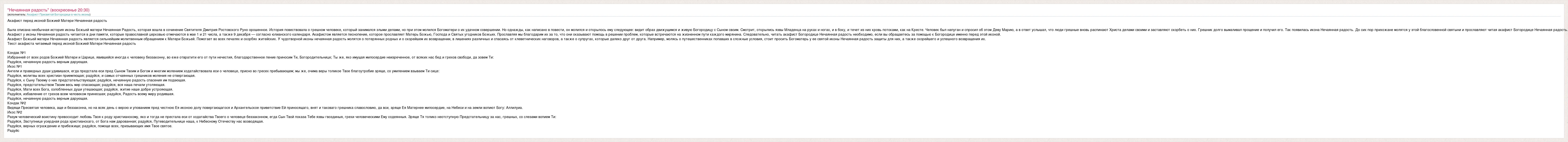 Акафист перед иконой Божией Матери Нечаянная радость Была описана необычная история иконы Божьей матери Нечаянная Радость, которая вошла в сочинение Святителя Дмитрия Ростовского Руно орошенное. История повествовала о грешном человеке, который занимался злыми делами, но при этом молился Богоматери о их удачном совершении. Но однажды, как написано в повести, он молился и открылось ему следующее: видит образ движущимся и живую Богородицу с Сыном своим. Смотрит, открылись язвы Младенца на руках и ногах, и в боку, и течет из них кровь потоками, как на Кресте. Человек был напуган и спросил об этом Деву Марию, а в ответ услышал, что люди грешные вновь распинают Христа делами своими и заставляют скорбеть о них. Грешник долго вымаливал прощение и получил его. Так появилась икона Нечаянная радость. До сих пор прихожане молятся у этой благословенной святыни и прославляют читая акафист Богородице Нечаянная радость. Акафист у иконы Нечаянная радость читается в дни памяти, которые православной церковью отмечаются в мае 1 и 21 числа, а также 9 декабря — согласно юлианского календаря. Акафистом является песнопение, которое прославляет Матерь Божью, Господа и Святых угодников Божьих. Прославляя мы благодарим их за то, что они оказывают помощь в решении проблем, которые встречаются на жизненном пути каждого мирянина. Следовательно, читать акафист Богородице Нечаянная радость необходимо, если вы обращаетесь за помощью к Богородице именно перед этой иконой. Акафист Божьей матери Нечаянная радость является сильнейшим молитвенным обращением к Матери Божьей. Помогает во всех печалях и скорбях житейских. У чудотворной иконы нечаянная радость молятся о потерянных родных и о скорейшем их возвращении, в лишениях различных и спасаясь от клеветнических наговоров, а также о супругах, которые далеко друг от друга. Например, молясь о путешественниках попавших в сложные условия, стоит просить Богоматерь у ее святой иконы Нечаянная радость защиты для них, а также скорейшего и успешного возвращения их. Текст акафиста читаемый перед иконой Божией Матери Нечаянная радость Кондак №1 Избранней от всех родов Божией Матери и Царице, явившейся иногда к человеку беззаконну, во еже отвратити его от пути нечестия, благодарственное пение приносим Ти, Богородительнице; Ты же, яко имущая милосердие неизреченное, от всяких нас бед и грехов свободи, да зовем Ти: Радуйся, нечаянную радость верным дарующая. Икос №1 Ангели и праведных души удивишася, егда предстала еси пред Сыном Твоим и Богом и многим молением ходатайствовала еси о человеце, присно во гресех пребывающем; мы же, очима веры толикое Твое благоутробие зряще, со умилением взываем Ти сице: Радуйся, молитвы всех христиан приемлющая; радуйся, и самых отчаянных грешников моления не отвергающая. Радуйся, к Сыну Твоему о них предстательствующая; радуйся, нечаянную радость спасения им подающая. Радуйся, предстательством Твоим весь мир спасающая; радуйся, вся наша печали утоляющая. Радуйся, Мати всех Бога, озлобленных души утешающая; радуйся, житие наше добре устрояющая. Радуйся, избавление от грехов всем человеком принесшая; радуйся, Радость всему миру родившая. Радуйся, нечаянную радость верным дарующая. Кондак №2 Видящи Пресвятая человека, аще и беззаконна, но на всяк день с верою и упованием пред честною Ея иконо