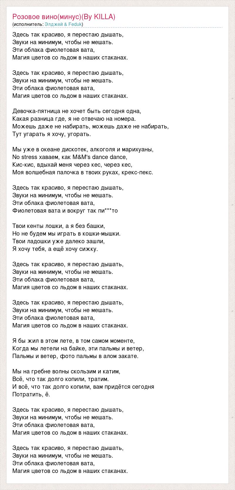 Здесь так красиво, я перестаю дышать, Звуки на минимум, чтобы не мешать. Эти облака фиолетовая вата, Магия цветов со льдом в наших стаканах. Здесь так красиво, я перестаю дышать, Звуки на минимум, чтобы не мешать. Эти облака фиолетовая вата, Магия цветов со льдом в наших стаканах. Девочка-пятница не хочет быть сегодня одна, Какая разница где, я не отвечаю на номера. Можешь даже не набирать, можешь даже не набирать, Тут угарать я хочу, угорать. Мы уже в океане дискотек, алкоголя и марихуаны, No stress хаваем, как M&M's dance dance, Кис-кис, вдыхай меня через кес, через кес, Моя волшебная палочка в твоих руках, крекс-пекс. Здесь так красиво, я перестаю дышать, Звуки на минимум, чтобы не мешать. Эти облака фиолетовая вата, Фиолетовая вата и вокруг так пи***то Твои кенты лошки, а я без башки, Но не будем мы играть в кошки-мышки. Твои ладошки уже далеко зашли, Я хочу тебя, а ещё хочу сижку. Здесь так красиво, я перестаю дышать, Звуки на минимум, чтобы не мешать. Эти облака фиолетовая вата, Магия цветов со льдом в наших стаканах. Здесь так красиво, я перестаю дышать, Звуки на минимум, чтобы не мешать. Эти облака фиолетовая вата, Магия цветов со льдом в наших стаканах. Я бы жил в этом лете, в том самом моменте, Когда мы летели на байке, эти пальмы и ветер, Пальмы и ветер, фото пальмы в алом закате. Мы на гребне волны скользим и катим, Всё, что так долго копили, тратим. И всё, что так долго копили, вам придётся сегодня Потратить, ё. Здесь так красиво, я перестаю дышать, Звуки на минимум, чтобы не мешать. Эти облака фиолетовая вата, Магия цветов со льдом в наших стаканах. Здесь так красиво, я перестаю дышать, Звуки на минимум, чтобы не мешать. Эти облака фиолетовая вата, Магия цветов со льдом в наших стаканах.