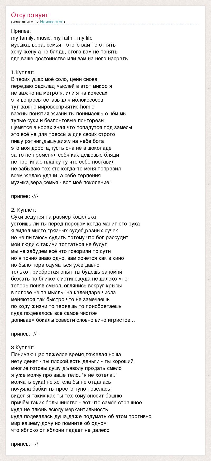 Припев: my family, music, my faith - my life музыка, вера, семья - этого вам не отнять хочу жену а не блядь, этого вам не понять где ваше достоинство или вам на него насрать 1.Куплет: В твоих ушах моё соло, цени снова передаю расклад мыслей в этот микро я не важно на метро я, или я на колесах эти вопросы оставь для молокососов тут важно мировосприятие homie важны понятия жизни ты понимаешь о чём мы тупые суки и безпонтовые понторезы щемятся в норах зная что попадутся под замесы это всё не для прессы а для своих строго пишу рэпчик,дышу,вижу на небе бога это моя дорога,пусть она не в шоколаде за то не променял себя как дешевые бляди не прогинаю планку ту что себе поставил не забываю тех кто когда-то меня поправил всем желаю удачи, а себе терпения музыка,вера,семья - вот моё поколение! припев: -//- 2. Куплет: Суки ведутся на размер кошелька устоишь ли ты перед пороком когда манит его рука я видел много грязных судеб,разных сучек но не пытаюсь судить потому что бог рассудит мои люди с такими топтаться не будут мы не забудем всё что говорили по сути но я точно знаю одно, вам хочется как в кино но было пора одуматься уже давно только приобретая опыт ты будешь запомни бежать по ближе к истине,куда не далеко мне теперь поняв смысл, оглянись вокруг крысы в голове не та мысль, на календаре числа меняются так быстро что не замечаешь по ходу жизни то теряешь то приобретаешь куда подевалось все самое чистое допиваем бокалы совести словно вино игристое... припев: -//- 3.Куплет: Понимаю щас тяжелое время,тяжелая ноша нету денег - ты плохой,есть деньги - ты хороший многие готовы душу дъяволу продать смело я уже молчу про ваше тело.."я не хотела.." молчать сука! не хотела бы не отдалась почуяла бабки ты просто тупо повелась видел я таких как ты тех кому сносит башню причём таких большинство - вот что самое страшное куда не плюнь всюду меркантильность куда подевалась душа,даже подумать об этом противно мир вашему дому но помните об одном что яблоко от яблони падает не далеко припев: - // -