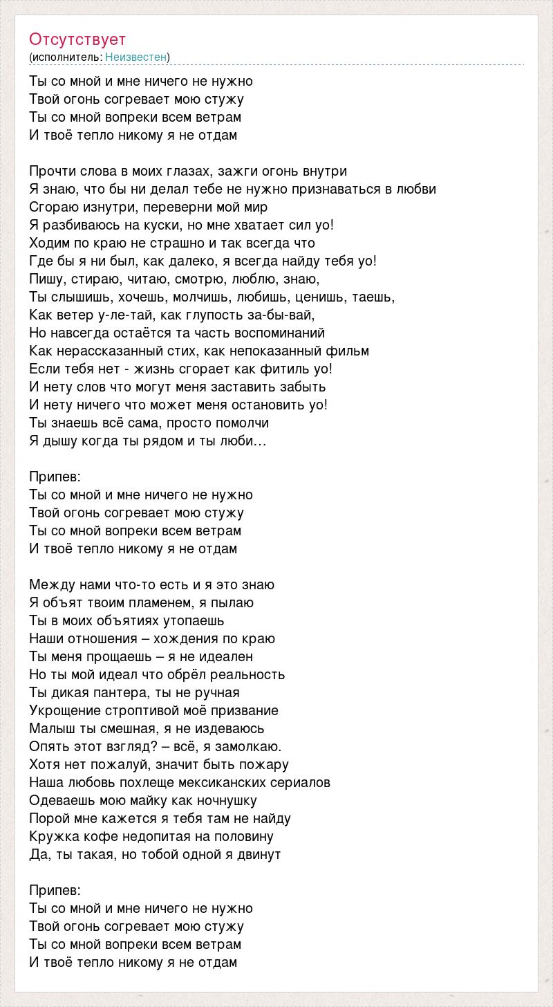 Ты со мной и мне ничего не нужно Твой огонь согревает мою стужу Ты со мной вопреки всем ветрам И твоё тепло никому я не отдам Прочти слова в моих глазах, зажги огонь внутри Я знаю, что бы ни делал тебе не нужно признаваться в любви Сгораю изнутри, переверни мой мир Я разбиваюсь на куски, но мне хватает сил yo! Ходим по краю не страшно и так всегда что Где бы я ни был, как далеко, я всегда найду тебя yo! Пишу, стираю, читаю, смотрю, люблю, знаю, Ты слышишь, хочешь, молчишь, любишь, ценишь, таешь, Как ветер у-ле-тай, как глупость за-бы-вай, Но навсегда остаётся та часть воспоминаний Как нерассказанный стих, как непоказанный фильм Если тебя нет - жизнь сгорает как фитиль yo! И нету слов что могут меня заставить забыть И нету ничего что может меня остановить yo! Ты знаешь всё сама, просто помолчи Я дышу когда ты рядом и ты люби… Припев: Ты со мной и мне ничего не нужно Твой огонь согревает мою стужу Ты со мной вопреки всем ветрам И твоё тепло никому я не отдам Между нами что-то есть и я это знаю Я объят твоим пламенем, я пылаю Ты в моих объятиях утопаешь Наши отношения – хождения по краю Ты меня прощаешь – я не идеален Но ты мой идеал что обрёл реальность Ты дикая пантера, ты не ручная Укрощение строптивой моё призвание Малыш ты смешная, я не издеваюсь Опять этот взгляд? – всё, я замолкаю. Хотя нет пожалуй, значит быть пожару Наша любовь похлеще мексиканских сериалов Одеваешь мою майку как ночнушку Порой мне кажется я тебя там не найду Кружка кофе недопитая на половину Да, ты такая, но тобой одной я двинут Припев: Ты со мной и мне ничего не нужно Твой огонь согревает мою стужу Ты со мной вопреки всем ветрам И твоё тепло никому я не отдам