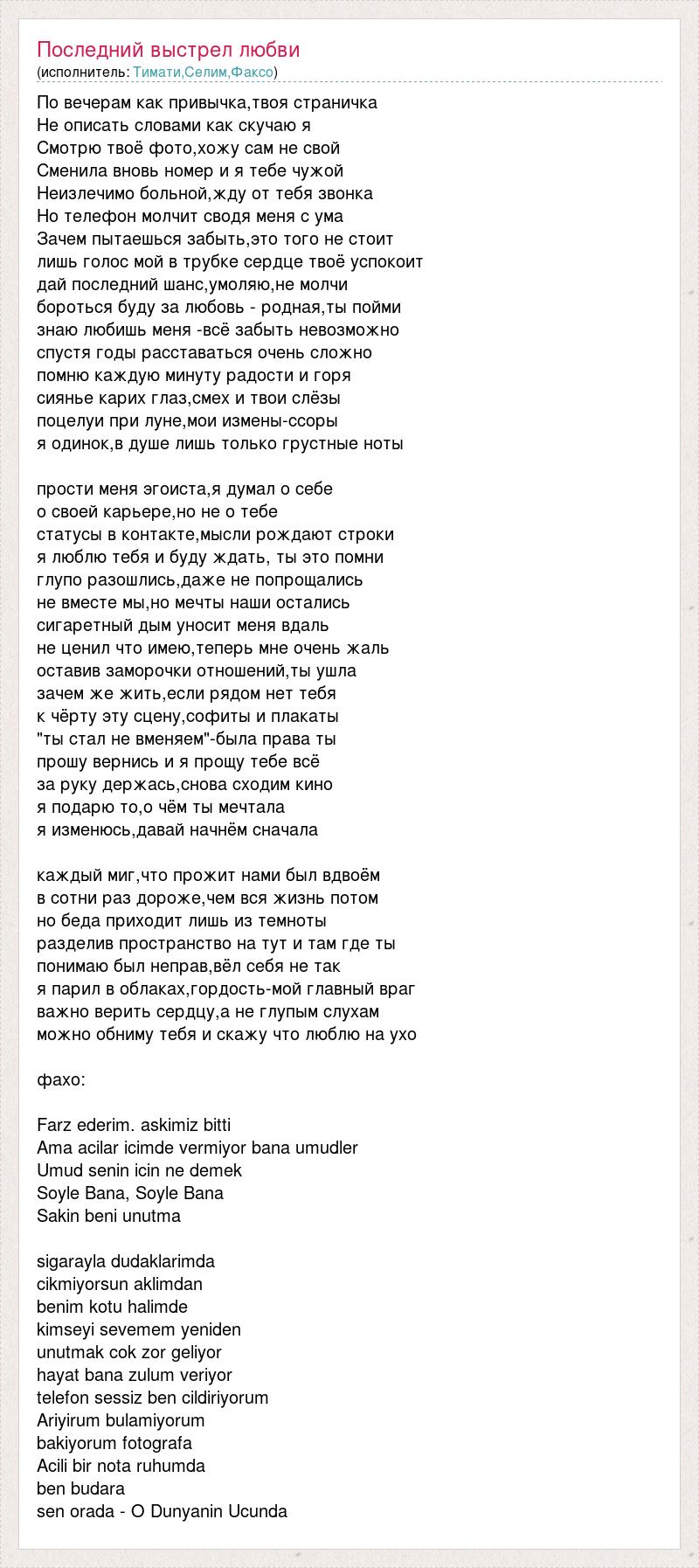По вечерам как привычка,твоя страничка Не описать словами как скучаю я Смотрю твоё фото,хожу сам не свой Сменила вновь номер и я тебе чужой Неизлечимо больной,жду от тебя звонка Но телефон молчит сводя меня с ума Зачем пытаешься забыть,это того не стоит лишь голос мой в трубке сердце твоё успокоит дай последний шанс,умоляю,не молчи бороться буду за любовь - родная,ты пойми знаю любишь меня -всё забыть невозможно спустя годы расставаться очень сложно помню каждую минуту радости и горя сиянье карих глаз,смех и твои слёзы поцелуи при луне,мои измены-ссоры я одинок,в душе лишь только грустные ноты прости меня эгоиста,я думал о себе о своей карьере,но не о тебе статусы в контакте,мысли рождают строки я люблю тебя и буду ждать, ты это помни глупо разошлись,даже не попрощались не вместе мы,но мечты наши остались сигаретный дым уносит меня вдаль не ценил что имею,теперь мне очень жаль оставив заморочки отношений,ты ушла зачем же жить,если рядом нет тебя к чёрту эту сцену,софиты и плакаты "ты стал не вменяем"-была права ты прошу вернись и я прощу тебе всё за руку держась,снова сходим кино я подарю то,о чём ты мечтала я изменюсь,давай начнём сначала каждый миг,что прожит нами был вдвоём в сотни раз дороже,чем вся жизнь потом но беда приходит лишь из темноты разделив пространство на тут и там где ты понимаю был неправ,вёл себя не так я парил в облаках,гордость-мой главный враг важно верить сердцу,а не глупым слухам можно обниму тебя и скажу что люблю на ухо фахо: Farz ederim. askimiz bitti Ama acilar icimde vermiyor bana umudler Umud senin icin ne demek Soyle Bana, Soyle Bana Sakin beni unutma sigarayla dudaklarimda cikmiyorsun aklimdan benim kotu halimde kimseyi sevemem yeniden unutmak cok zor geliyor hayat bana zulum veriyor telefon sessiz ben cildiriyorum Ariyirum bulamiyorum bakiyorum fotografa Acili bir nota ruhumda ben budara sen orada - O Dunyanin Ucunda