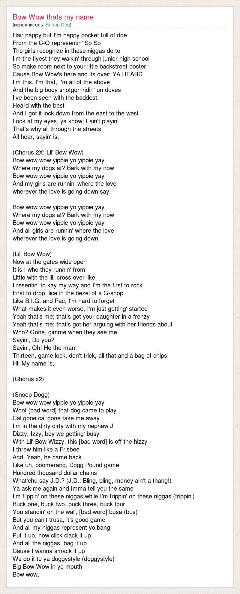 Hair nappy but I'm happy pocket full of doe From the C-O representin' So So The girls recognize in these niggas do to I'm the flyest they walkin' through junior high school So make room next to your little backstreet poster Cause Bow Wow's here and its over; YA HEARD I'm this, I'm that, I'm all of the above And the big body shotgun ridin' on doves I've been seen with the baddest Heard with the best And I got it lock down from the east to the west Look at my eyes, ya know; I ain't playin' That's why all through the streets All hear, sayin' is, (Chorus 2X: Lil' Bow Wow) Bow wow wow yippie yo yippie yay Where my dogs at? Bark with my now Bow wow wow yippie yo yippie yay And my girls are runnin' where the love wherever the love is going down say, Bow wow wow yippie yo yippie yay Where my dogs at? Bark with my now Bow wow wow yippie yo yippie yay And all girls are runnin' where the love wherever the love is going down (Lil' Bow Wow) Now at the gates wide open It is I who they runnin' from Little with the ill, cross over like I resentin' to kay my way and I'm the first to rock First to drop, lice in the bezel of a G-shop Like B.I.G. and Pac, I'm hard to forget What makes it even worse, I'm just getting' started Yeah that's me; that's got your daughter in a frenzy Yeah that's me; that's got her arguing with her friends about Who? Gone, gimme when they see me Sayin', Do you? Sayin', Oh! He the man! Thirteen, game lock, don't trick, all that and a bag of chips Hi! My name is, (Chorus x2) (Snoop Dogg) Bow wow wow yippie yo yippie yay Woof [bad word] that dog came to play Cal gone cal gone take me away I'm in the dirty dirty with my nephew J Dizzy, Izzy, boy we getting' busy With Lil' Bow Wizzy, this [bad word] is off the hizzy I threw him like a Frisbee And, Yeah, he came back. Like uh, boomerang, Dogg Pound game Hundred thousand dollar chains What'chu say J.D.? (J.D.: Bling, bling, money ain't a thang!) Ya ask me again and Imma tell you the same I'm flippin' on these niggas while I'm trippin' on these niggas (trippin') Buck one, buck two, buck three, buck four You standin' on the wall, [bad word] busa (bus) But you can't trusa, it's good game And all my niggas represent yo bang Put it up, now click clack it up And all the niggas, bag it up Cause I wanna smack it up We do it to ya doggystyle (doggystyle) Big Bow Wow in yo mouth Bow wow,