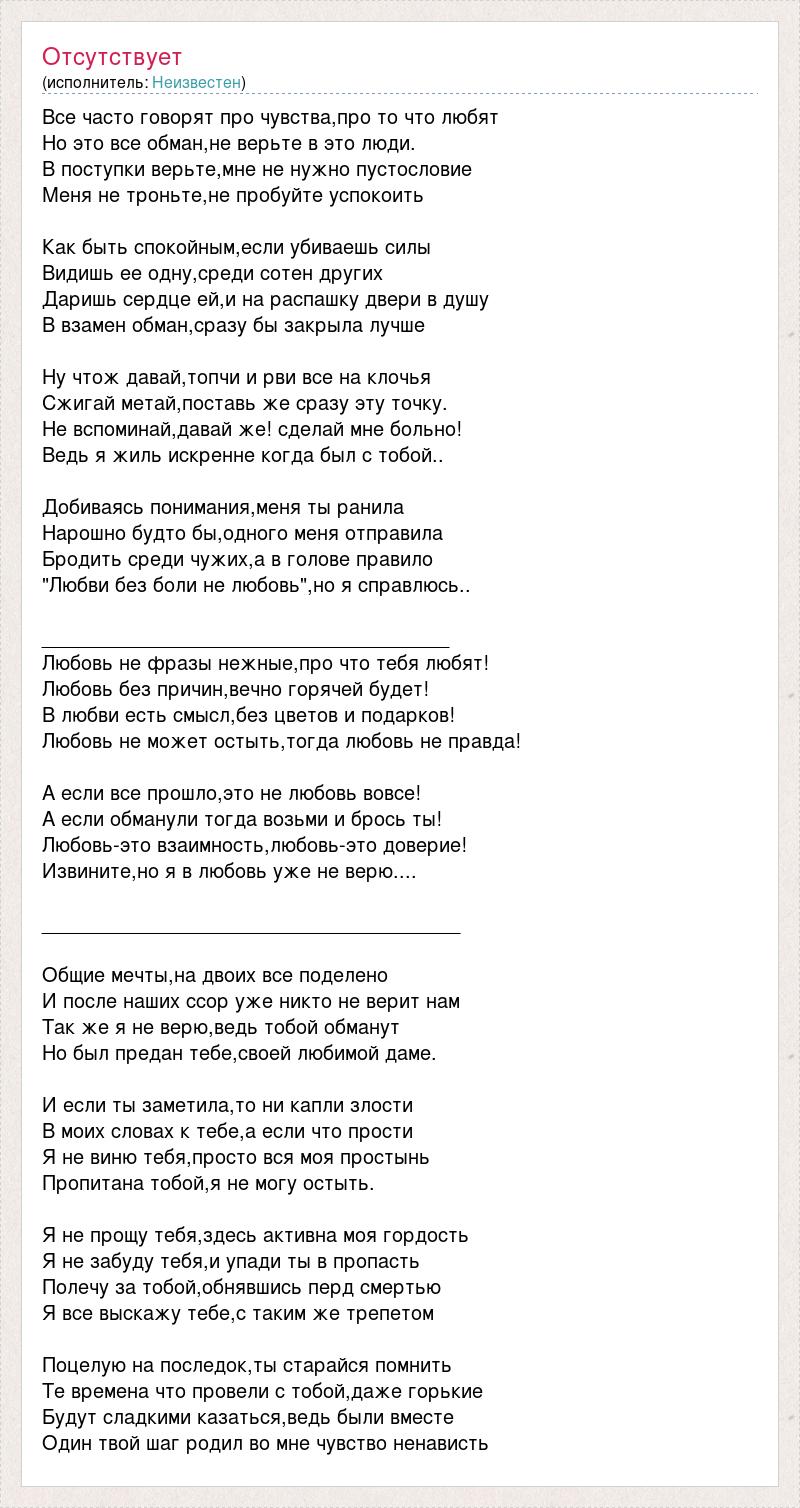 Все часто говорят про чувства,про то что любят Но это все обман,не верьте в это люди. В поступки верьте,мне не нужно пустословие Меня не троньте,не пробуйте успокоить Как быть спокойным,если убиваешь силы Видишь ее одну,среди сотен других Даришь сердце ей,и на распашку двери в душу В взамен обман,сразу бы закрыла лучше Ну чтож давай,топчи и рви все на клочья Сжигай метай,поставь же сразу эту точку. Не вспоминай,давай же! сделай мне больно! Ведь я жиль искренне когда был с тобой.. Добиваясь понимания,меня ты ранила Нарошно будто бы,одного меня отправила Бродить среди чужих,а в голове правило "Любви без боли не любовь",но я справлюсь.. _____________________________________ Любовь не фразы нежные,про что тебя любят! Любовь без причин,вечно горячей будет! В любви есть смысл,без цветов и подарков! Любовь не может остыть,тогда любовь не правда! А если все прошло,это не любовь вовсе! А если обманули тогда возьми и брось ты! Любовь-это взаимность,любовь-это доверие! Извините,но я в любовь уже не верю.... ______________________________________ Общие мечты,на двоих все поделено И после наших ссор уже никто не верит нам Так же я не верю,ведь тобой обманут Но был предан тебе,своей любимой даме. И если ты заметила,то ни капли злости В моих словах к тебе,а если что прости Я не виню тебя,просто вся моя простынь Пропитана тобой,я не могу остыть. Я не прощу тебя,здесь активна моя гордость Я не забуду тебя,и упади ты в пропасть Полечу за тобой,обнявшись перд смертью Я все выскажу тебе,с таким же трепетом Поцелую на последок,ты старайся помнить Те времена что провели с тобой,даже горькие Будут сладкими казаться,ведь были вместе Один твой шаг родил во мне чувство ненависть