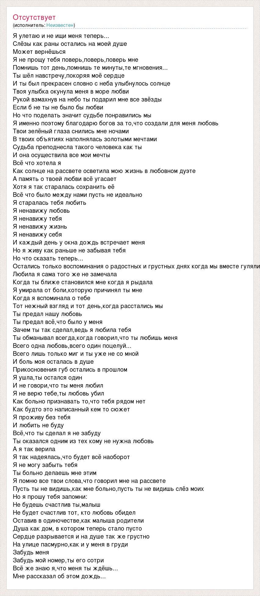 Я улетаю и не ищи меня теперь... Слёзы как раны остались на моей душе Может вернёшься Я не прощу тебя поверь,поверь,поверь мне Помнишь тот день,помнишь те минуты,те мгновения... Ты шёл навстречу,покоряя моё сердце И ты был прекрасен словно с неба улыбнулось солнце Твоя улыбка окунула меня в море любви Рукой взмахнув на небо ты подарил мне все звёзды Если б не ты не было бы любви Но что поделать значит судьбе понравились мы Я именно поэтому благодарю богов за то,что создали для меня любовь Твои зелёный глаза снились мне ночами В твоих объятиях наполнялась золотыми мечтами Судьба преподнесла такого человека как ты И она осуществила все мои мечты Всё что хотела я Как солнце на рассвете осветила мою жизнь в любовном дуэте А память о твоей любви всё угасает Хотя я так старалась сохранить её Всё что было между нами пусть не идеально Я старалась тебя любить Я ненавижу любовь Я ненавижу тебя Я ненавижу жизнь Я ненавижу себя И каждый день у окна дождь встречает меня Но я живу как раньше не забывая тебя Но что сказать теперь... Остались только воспоминания о радостных и грустных днях когда мы вместе гуляли Любила я сама того же не замечала Когда ты ближе становился мне когда я рыдала Я умирала от боли,которую причинял ты мне Когда я вспоминала о тебе Тот нежный взгляд и тот день,когда расстались мы Ты предал нашу любовь Ты предал всё,что было у меня Зачем ты так сделал,ведь я любила тебя Ты обманывал всегда,когда говорил,что ты любишь меня Всего одна любовь,всего один поцелуй... Всего лишь только миг и ты уже не со мной И боль моя осталась в душе Прикосновения губ остались в прошлом Я ушла,ты остался один И не говори,что ты меня любил Я не верю тебе,ты любовь убил Как больно признавать то,что тебя рядом нет Как будто это написанный кем то сюжет Я проживу без тебя И любить не буду Всё,что ты сделал я не забуду Ты оказался одним из тех кому не нужна любовь А я так верила Я так надеялась,что будет всё наоборот Я не могу забыть тебя Ты больно делаешь мне этим Я помню все твои слова,что говорил мне на рассвете Пусть ты не видишь,как мне больно,пусть ты не видишь слёз моих Но я прошу тебя запомни: Не будешь счастлив ты,малыш Не будет счастлив тот, кто любовь обидел Оставив в одиночестве,как малыша родители Душа как дом, в котором теперь стало пусто Сердце разрывается и на душе так же грустно На улице пасмурно,как и у меня в груди Забудь меня Забудь мой номер,ты его сотри Всё же знаю я,что меня ты ждёшь... Мне рассказал об этом дождь...