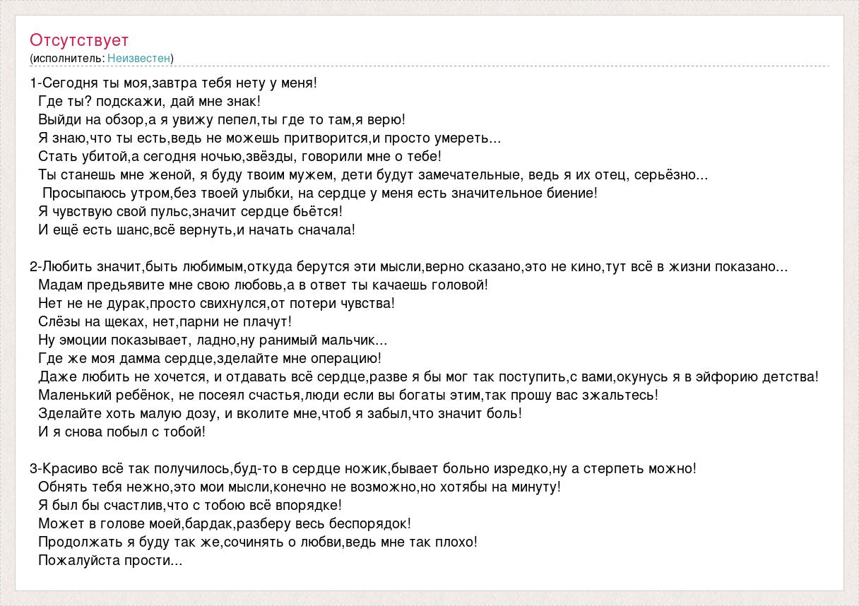 А как ты думаешь, о чем песня "1-Сегодня ты моя,завтра тебя нету у меня!" ?
