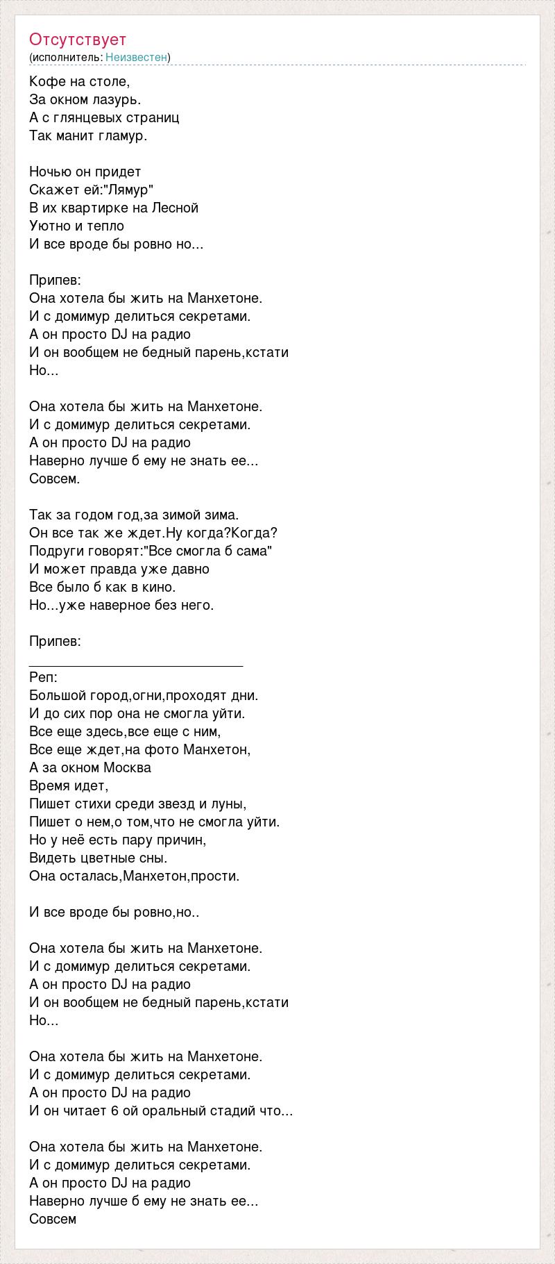 Кофе на столе, За окном лазурь. А с глянцевых страниц Так манит гламур. Ночью он придет Скажет ей:"Лямур" В их квартирке на Лесной Уютно и тепло И все вроде бы ровно но... Припев: Она хотела бы жить на Манхетоне. И с домимур делиться секретами. А он просто DJ на радио И он вообщем не бедный парень,кстати Но... Она хотела бы жить на Манхетоне. И с домимур делиться секретами. А он просто DJ на радио Наверно лучше б ему не знать ее... Совсем. Так за годом год,за зимой зима. Он все так же ждет.Ну когда?Когда? Подруги говорят:"Все смогла б сама" И может правда уже давно Все было б как в кино. Но...уже наверное без него. Припев: ____________________________ Реп: Большой город,огни,проходят дни. И до сих пор она не смогла уйти. Все еще здесь,все еще с ним, Все еще ждет,на фото Манхетон, А за окном Москва Время идет, Пишет стихи среди звезд и луны, Пишет о нем,о том,что не смогла уйти. Но у неё есть пару причин, Видеть цветные сны. Она осталась,Манхетон,прости. И все вроде бы ровно,но.. Она хотела бы жить на Манхетоне. И с домимур делиться секретами. А он просто DJ на радио И он вообщем не бедный парень,кстати Но... Она хотела бы жить на Манхетоне. И с домимур делиться секретами. А он просто DJ на радио И он читает 6 ой оральный стадий что... Она хотела бы жить на Манхетоне. И с домимур делиться секретами. А он просто DJ на радио Наверно лучше б ему не знать ее... Совсем