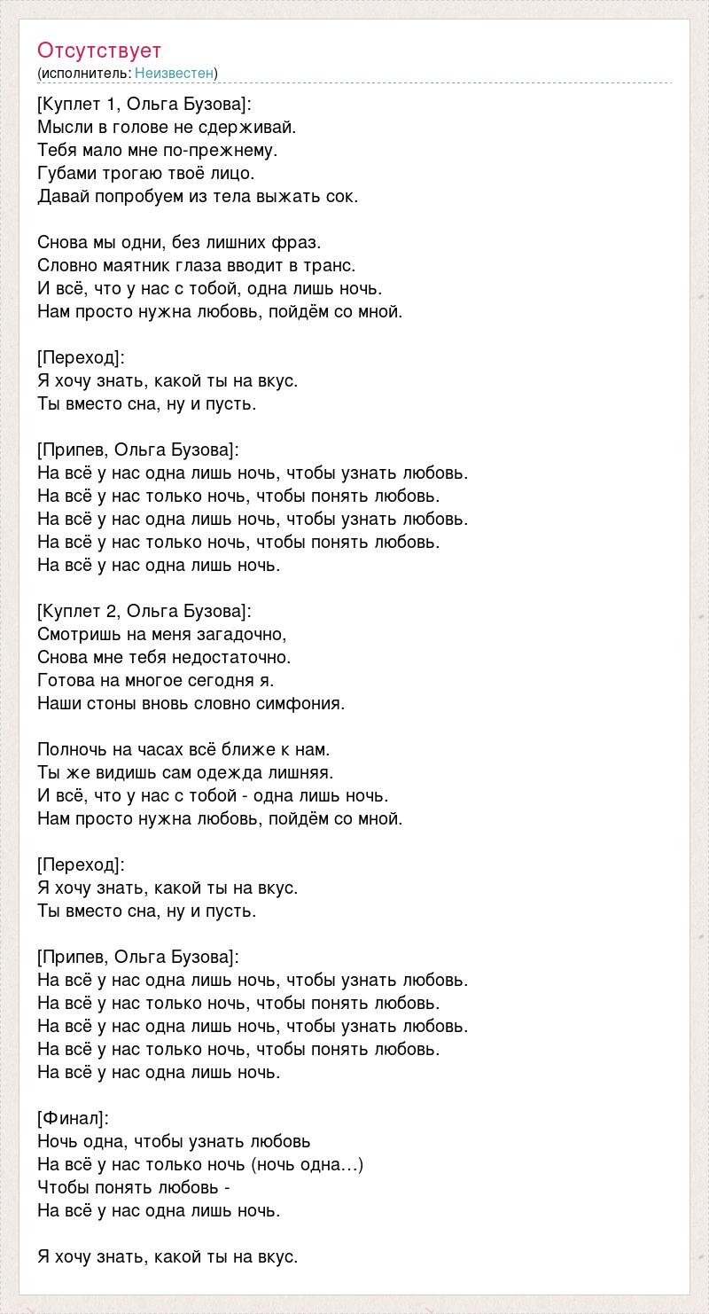 [Куплет 1, Ольга Бузова]: Мысли в голове не сдерживай. Тебя мало мне по-прежнему. Губами трогаю твоё лицо. Давай попробуем из тела выжать сок. Снова мы одни, без лишних фраз. Словно маятник глаза вводит в транс. И всё, что у нас с тобой, одна лишь ночь. Нам просто нужна любовь, пойдём со мной. [Переход]: Я хочу знать, какой ты на вкус. Ты вместо сна, ну и пусть. [Припев, Ольга Бузова]: На всё у нас одна лишь ночь, чтобы узнать любовь. На всё у нас только ночь, чтобы понять любовь. На всё у нас одна лишь ночь, чтобы узнать любовь. На всё у нас только ночь, чтобы понять любовь. На всё у нас одна лишь ночь. [Куплет 2, Ольга Бузова]: Смотришь на меня загадочно, Снова мне тебя недостаточно. Готова на многое сегодня я. Наши стоны вновь словно симфония. Полночь на часах всё ближе к нам. Ты же видишь сам одежда лишняя. И всё, что у нас с тобой - одна лишь ночь. Нам просто нужна любовь, пойдём со мной. [Переход]: Я хочу знать, какой ты на вкус. Ты вместо сна, ну и пусть. [Припев, Ольга Бузова]: На всё у нас одна лишь ночь, чтобы узнать любовь. На всё у нас только ночь, чтобы понять любовь. На всё у нас одна лишь ночь, чтобы узнать любовь. На всё у нас только ночь, чтобы понять любовь. На всё у нас одна лишь ночь. [Финал]: Ночь одна, чтобы узнать любовь На всё у нас только ночь (ночь одна…) Чтобы понять любовь - На всё у нас одна лишь ночь. Я хочу знать, какой ты на вкус.
