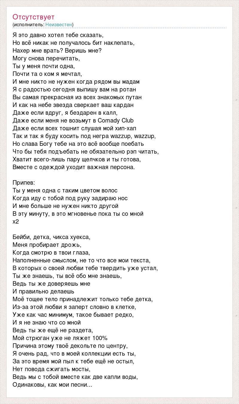 Я это давно хотел тебе сказать, Но всё никак не получалось бит наклепать, Нахер мне врать? Веришь мне? Могу снова перечитать, Ты у меня почти одна, Почти та о ком я мечтал, И мне никто не нужен когда рядом вы мадам Я с радостью сегодня выпишу вам на ротан Вы самая прекрасная из всех знакомых путан И как на небе звезда сверкает ваш кардан Даже если вдруг, я бездарен в калл, Даже если меня не возьмут в Comady Club Даже если всех тошнит слушая мой хип-хап Так и так я буду косить под негра wazzup, wazzup, Но слава Богу тебе на это всё вообще поебать Что бы тебя подъебать не обязательно рэп читать, Хватит всего-лишь пару щелчков и ты готова, Вместе с одеждой уходит важная персона. Припев: Ты у меня одна с таким цветом волос Когда иду с тобой под руку задираю нос И мне больше не нужен никто другой В эту минуту, в это мгновенье пока ты со мной x2 Бейби, детка, чикса хуекса, Меня пробирает дрожь, Когда смотрю в твои глаза, Наполненные смыслом, не то что все мои текста, В которых о своей любви тебе твердить уже устал, Ты же знаешь, ты всё обо мне знаешь, Ведь ты же доверяешь мне И правильно делаешь Моё тощее тело принадлежит только тебе детка, Из-за этой любви я заперт словно в клетке, Уже как час минимум, такое бывает редко, И я не знаю что со мной Ведь ты же ещё не раздета, Мой стрюган уже не ляжет 100% Причина этому твоё декольте по центру, Я очень рад, что в моей коллекции есть ты, За это время мой пыл к тебе ещё не остыл, Нет повода сжигать мосты, Ведь мы с тобой вместе как две капли воды, Одинаковы, как мои песни...
