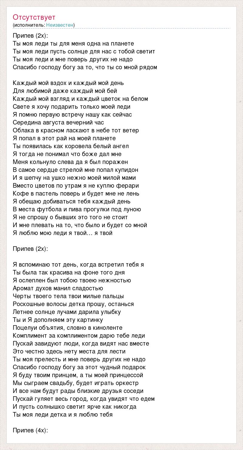 Припев (2х): Ты моя леди ты для меня одна на планете Ты моя леди пусть солнце для нас с тобой светит Ты моя леди и мне поверь других не надо Спасибо господу богу за то, что ты со мной рядом Каждый мой вздох и каждый мой день Для любимой даже каждый мой бей Каждый мой взгляд и каждый цветок на белом Свете я хочу подарить только моей леди Я помню первую встречу нашу как сейчас Середина августа вечерний час Облака в красном ласкают в небе тот ветер Я попал в этот рай на моей планете Ты появилась как коровела белый ангел Я тогда не понимал что боже дал мне Меня кольнуло слева да я был поражен В самое сердце стрелой мне попал купидон И я шепчу на ушко нежно моей милой мами Вместо цветов по утрам я не куплю ферари Кофе в пастель поверь и будет мне не лень Я обещаю добиваться тебя каждый день В места футбола и пива прогулки под луною Я не спрошу о бывших это того не стоит И мне плевать на то, что было и будет со мной Я люблю мою леди я твой… я твой Припев (2х): Я вспоминаю тот день, когда встретил тебя я Ты была так красива на фоне того дня Я ослеплен был тобою твоею нежностью Аромат духов манил сладостью Черты твоего тела твои милые пальцы Роскошные волосы детка прошу, останься Летнее солнце лучами дарила улыбку Ты и Я дополняем эту картинку Поцелуи объятия, словно в киноленте Комплимент за комплиментом дарю тебе леди Пускай завидуют люди, когда видят нас вместе Это честно здесь нету места для лести Ты моя прелесть и мне поверь других не надо Спасибо господу богу за этот чудный подарок Я буду твоим принцем, а ты моей принцессой Мы сыграем свадьбу, будет играть оркестр И все нам будут рады близкие друзья соседи Пускай гуляет весь город, когда увидят что едем И пусть солнышко светит ярче как никогда Ты моя леди детка и я люблю тебя Припев (4х):