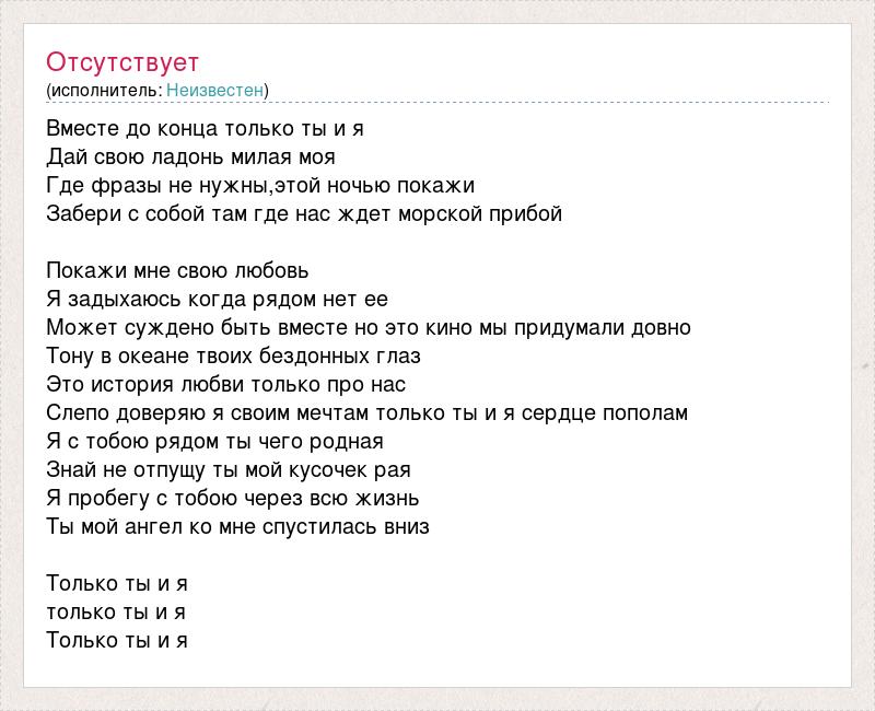 Вместе до конца только ты и я Дай свою ладонь милая моя Где фразы не нужны,этой ночью покажи Забери с собой там где нас ждет морской прибой Покажи мне свою любовь Я задыхаюсь когда рядом нет ее Может суждено быть вместе но это кино мы придумали довно Тону в океане твоих бездонных глаз Это история любви только про нас Слепо доверяю я своим мечтам только ты и я сердце пополам Я с тобою рядом ты чего родная Знай не отпущу ты мой кусочек рая Я пробегу с тобою через всю жизнь Ты мой ангел ко мне спустилась вниз Только ты и я только ты и я Только ты и я