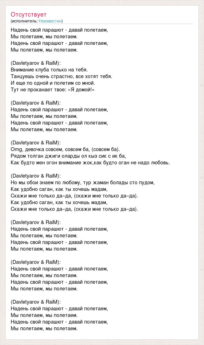Надень свой парашют - давай полетаем, Мы полетаем, мы полетаем. Надень свой парашют - давай полетаем, Мы полетаем, мы полетаем. (Davletyarov & RaiM): Внимание клуба только на тебя. Танцуешь очень страстно, все хотят тебя. И еще по одной и полетим со мной. Тут не проканает твое: «Я домой!» (Davletyarov & RaiM): Надень свой парашют - давай полетаем, Мы полетаем, мы полетаем. Надень свой парашют - давай полетаем, Мы полетаем, мы полетаем. (Davletyarov & RaiM): Оmg, девочка совсем, совсем ба, (совсем ба). Рядом толган джиги оларды ол кыз сик с ик ба, Как будто мен огон внимание жок,как будто оган не надо любовь. (Davletyarov & RaiM): Но мы обои знаем по любому, тур жаман болады сто пудом, Как удобно саган, как ты хочешь мадам, Скажи мне только да–да, (скажи мне только да–да). Как удобно саган, как ты хочешь мадам, Скажи мне только да–да, (скажи мне только да–да). (Davletyarov & RaiM): Надень свой парашют - давай полетаем, Мы полетаем, мы полетаем. Надень свой парашют - давай полетаем, Мы полетаем, мы полетаем. (Davletyarov & RaiM): Надень свой парашют - давай полетаем, Мы полетаем, мы полетаем. Надень свой парашют - давай полетаем, Мы полетаем, мы полетаем. (Davletyarov & RaiM): Надень свой парашют - давай полетаем, Мы полетаем, мы полетаем. Надень свой парашют - давай полетаем, Мы полетаем, мы полетаем.