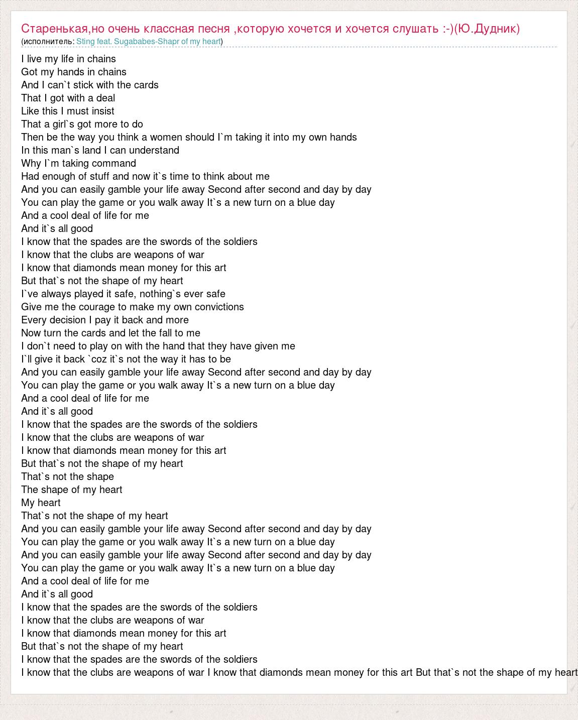I live my life in chains Got my hands in chains And I can`t stick with the cards That I got with a deal Like this I must insist That a girl`s got more to do Then be the way you think a women should I`m taking it into my own hands In this man`s land I can understand Why I`m taking command Had enough of stuff and now it`s time to think about me And you can easily gamble your life away Second after second and day by day You can play the game or you walk away It`s a new turn on a blue day And a cool deal of life for me And it`s all good I know that the spades are the swords of the soldiers I know that the clubs are weapons of war I know that diamonds mean money for this art But that`s not the shape of my heart I`ve always played it safe, nothing`s ever safe Give me the courage to make my own convictions Every decision I pay it back and more Now turn the cards and let the fall to me I don`t need to play on with the hand that they have given me I`ll give it back `coz it`s not the way it has to be And you can easily gamble your life away Second after second and day by day You can play the game or you walk away It`s a new turn on a blue day And a cool deal of life for me And it`s all good I know that the spades are the swords of the soldiers I know that the clubs are weapons of war I know that diamonds mean money for this art But that`s not the shape of my heart That`s not the shape The shape of my heart My heart That`s not the shape of my heart And you can easily gamble your life away Second after second and day by day You can play the game or you walk away It`s a new turn on a blue day And you can easily gamble your life away Second after second and day by day You can play the game or you walk away It`s a new turn on a blue day And a cool deal of life for me And it`s all good I know that the spades are the swords of the soldiers I know that the clubs are weapons of war I know that diamonds mean money for this art But that`s not the shape of my heart I know that the spades are the swords of the soldiers I know that the clubs are weapons of war I know that diamonds mean money for this art But that`s not the shape of my heart