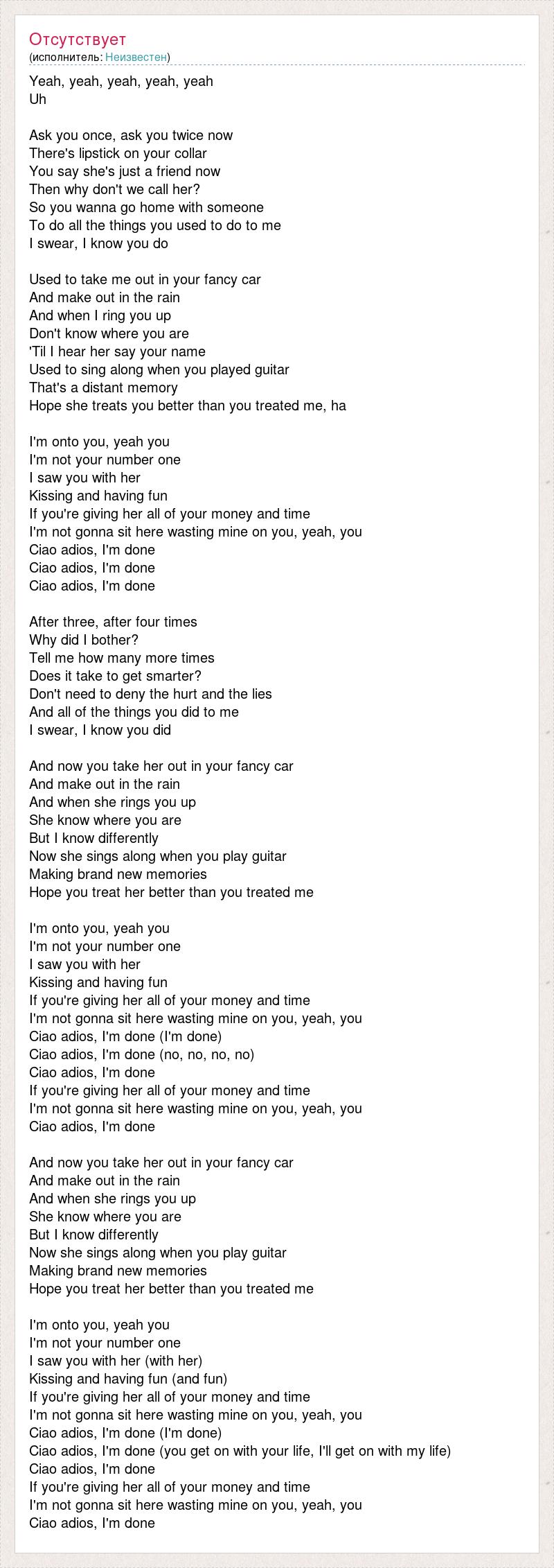 Yeah, yeah, yeah, yeah, yeah Uh Ask you once, ask you twice now There's lipstick on your collar You say she's just a friend now Then why don't we call her? So you wanna go home with someone To do all the things you used to do to me I swear, I know you do Used to take me out in your fancy car And make out in the rain And when I ring you up Don't know where you are 'Til I hear her say your name Used to sing along when you played guitar That's a distant memory Hope she treats you better than you treated me, ha I'm onto you, yeah you I'm not your number one I saw you with her Kissing and having fun If you're giving her all of your money and time I'm not gonna sit here wasting mine on you, yeah, you Ciao adios, I'm done Ciao adios, I'm done Ciao adios, I'm done After three, after four times Why did I bother? Tell me how many more times Does it take to get smarter? Don't need to deny the hurt and the lies And all of the things you did to me I swear, I know you did And now you take her out in your fancy car And make out in the rain And when she rings you up She know where you are But I know differently Now she sings along when you play guitar Making brand new memories Hope you treat her better than you treated me I'm onto you, yeah you I'm not your number one I saw you with her Kissing and having fun If you're giving her all of your money and time I'm not gonna sit here wasting mine on you, yeah, you Ciao adios, I'm done (I'm done) Ciao adios, I'm done (no, no, no, no) Ciao adios, I'm done If you're giving her all of your money and time I'm not gonna sit here wasting mine on you, yeah, you Ciao adios, I'm done And now you take her out in your fancy car And make out in the rain And when she rings you up She know where you are But I know differently Now she sings along when you play guitar Making brand new memories Hope you treat her better than you treated me I'm onto you, yeah you I'm not your number one I saw you with her (with her) Kissing and having fun (and fun) If you're giving her all of your money and time I'm not gonna sit here wasting mine on you, yeah, you Ciao adios, I'm done (I'm done) Ciao adios, I'm done (you get on with your life, I'll get on with my life) Ciao adios, I'm done If you're giving her all of your money and time I'm not gonna sit here wasting mine on you, yeah, you Ciao adios, I'm done
