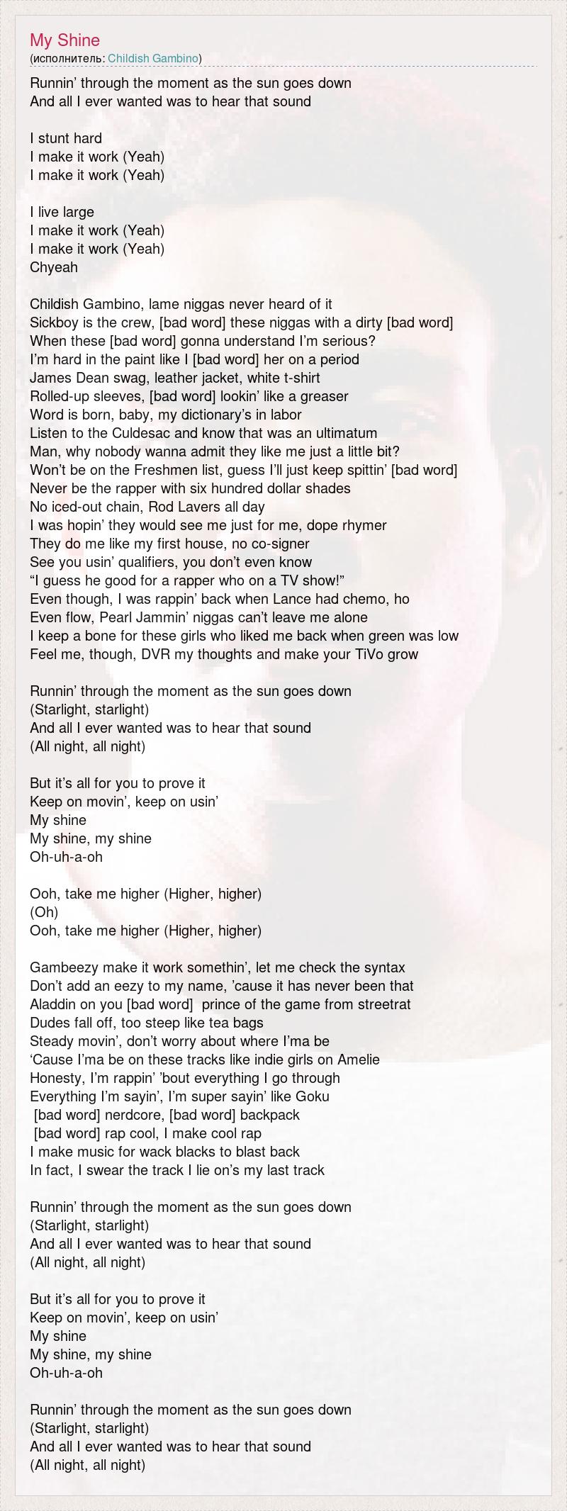 Runnin’ through the moment as the sun goes down And all I ever wanted was to hear that sound I stunt hard I make it work (Yeah) I make it work (Yeah) I live large I make it work (Yeah) I make it work (Yeah) Chyeah Childish Gambino, lame niggas never heard of it Sickboy is the crew, [bad word] these niggas with a dirty [bad word] When these [bad word] gonna understand I’m serious? I’m hard in the paint like I [bad word] her on a period James Dean swag, leather jacket, white t-shirt Rolled-up sleeves, [bad word] lookin’ like a greaser Word is born, baby, my dictionary’s in labor Listen to the Culdesac and know that was an ultimatum Man, why nobody wanna admit they like me just a little bit? Won’t be on the Freshmen list, guess I’ll just keep spittin’ [bad word] Never be the rapper with six hundred dollar shades No iced-out chain, Rod Lavers all day I was hopin’ they would see me just for me, dope rhymer They do me like my first house, no co-signer See you usin’ qualifiers, you don’t even know “I guess he good for a rapper who on a TV show!” Even though, I was rappin’ back when Lance had chemo, ho Even flow, Pearl Jammin’ niggas can’t leave me alone I keep a bone for these girls who liked me back when green was low Feel me, though, DVR my thoughts and make your TiVo grow Runnin’ through the moment as the sun goes down (Starlight, starlight) And all I ever wanted was to hear that sound (All night, all night) But it’s all for you to prove it Keep on movin’, keep on usin’ My shine My shine, my shine Oh-uh-a-oh Ooh, take me higher (Higher, higher) (Oh) Ooh, take me higher (Higher, higher) Gambeezy make it work somethin’, let me check the syntax Don’t add an eezy to my name, ’cause it has never been that Aladdin on you [bad word] prince of the game from streetrat Dudes fall off, too steep like tea bags Steady movin’, don’t worry about where I’ma be ‘Cause I’ma be on these tracks like indie girls on Amelie Honesty, I’m rappin’ ’bout everything I go through Everything I’m sayin’, I’m super sayin’ like Goku [bad word] nerdcore, [bad word] backpack [bad word] rap cool, I make cool rap I make music for wack blacks to blast back In fact, I swear the track I lie on’s my last track Runnin’ through the moment as the sun goes down (Starlight, starlight) And all I ever wanted was to hear that sound (All night, all night) But it’s all for you to prove it Keep on movin’, keep on usin’ My shine My shine, my shine Oh-uh-a-oh Runnin’ through the moment as the sun goes down (Starlight, starlight) And all I ever wanted was to hear that sound (All night, all night)