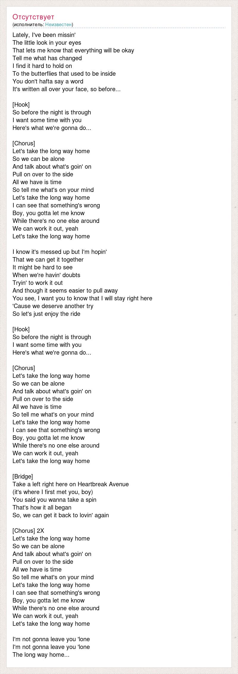 Lately, I've been missin' The little look in your eyes That lets me know that everything will be okay Tell me what has changed I find it hard to hold on To the butterflies that used to be inside You don't hafta say a word It's written all over your face, so before... [Hook] So before the night is through I want some time with you Here's what we're gonna do... [Chorus] Let's take the long way home So we can be alone And talk about what's goin' on Pull on over to the side All we have is time So tell me what's on your mind Let's take the long way home I can see that something's wrong Boy, you gotta let me know While there's no one else around We can work it out, yeah Let's take the long way home I know it's messed up but I'm hopin' That we can get it together It might be hard to see When we're havin' doubts Tryin' to work it out And though it seems easier to pull away You see, I want you to know that I will stay right here 'Cause we deserve another try So let's just enjoy the ride [Hook] So before the night is through I want some time with you Here's what we're gonna do... [Chorus] Let's take the long way home So we can be alone And talk about what's goin' on Pull on over to the side All we have is time So tell me what's on your mind Let's take the long way home I can see that something's wrong Boy, you gotta let me know While there's no one else around We can work it out, yeah Let's take the long way home [Bridge] Take a left right here on Heartbreak Avenue (it's where I first met you, boy) You said you wanna take a spin That's how it all began So, we can get it back to lovin' again [Chorus] 2X Let's take the long way home So we can be alone And talk about what's goin' on Pull on over to the side All we have is time So tell me what's on your mind Let's take the long way home I can see that something's wrong Boy, you gotta let me know While there's no one else around We can work it out, yeah Let's take the long way home I'm not gonna leave you 'lone I'm not gonna leave you 'lone The long way home...