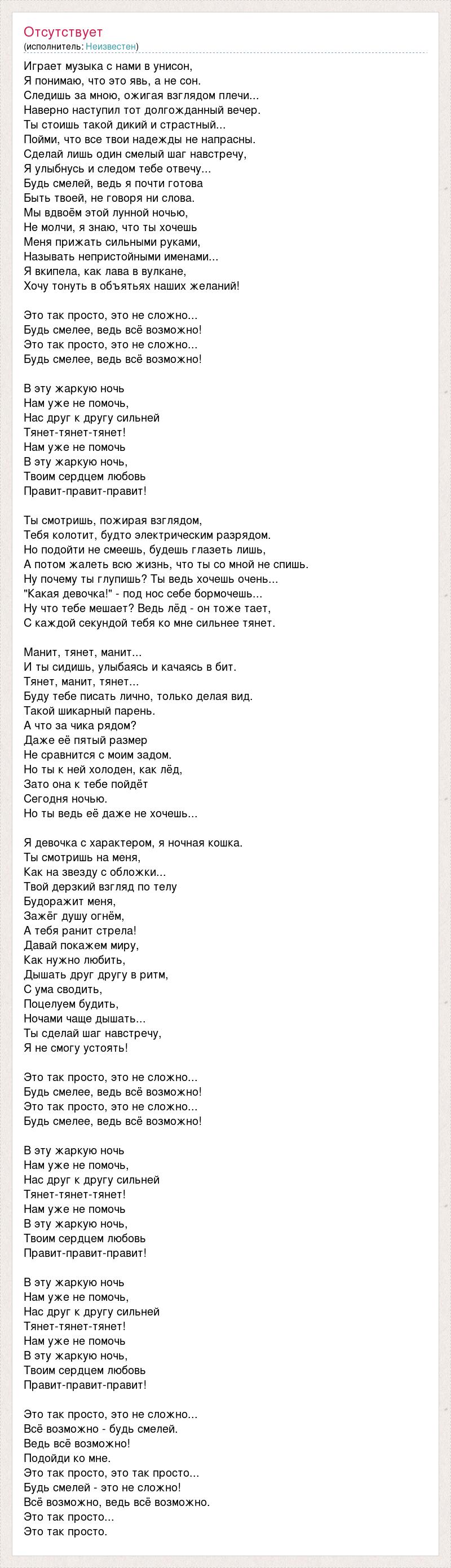 Играет музыка с нами в унисон, Я понимаю, что это явь, а не сон. Следишь за мною, ожигая взглядом плечи... Наверно наступил тот долгожданный вечер. Ты стоишь такой дикий и страстный... Пойми, что все твои надежды не напрасны. Сделай лишь один смелый шаг навстречу, Я улыбнусь и следом тебе отвечу... Будь смелей, ведь я почти готова Быть твоей, не говоря ни слова. Мы вдвоём этой лунной ночью, Не молчи, я знаю, что ты хочешь Меня прижать сильными руками, Называть непристойными именами... Я вкипела, как лава в вулкане, Хочу тонуть в объятьях наших желаний! Это так просто, это не сложно... Будь смелее, ведь всё возможно! Это так просто, это не сложно... Будь смелее, ведь всё возможно! В эту жаркую ночь Нам уже не помочь, Нас друг к другу сильней Тянет-тянет-тянет! Нам уже не помочь В эту жаркую ночь, Твоим сердцем любовь Правит-правит-правит! Ты смотришь, пожирая взглядом, Тебя колотит, будто электрическим разрядом. Но подойти не смеешь, будешь глазеть лишь, А потом жалеть всю жизнь, что ты со мной не спишь. Ну почему ты глупишь? Ты ведь хочешь очень... "Какая девочка!" - под нос себе бормочешь... Ну что тебе мешает? Ведь лёд - он тоже тает, С каждой секундой тебя ко мне сильнее тянет. Манит, тянет, манит... И ты сидишь, улыбаясь и качаясь в бит. Тянет, манит, тянет... Буду тебе писать лично, только делая вид. Такой шикарный парень. А что за чика рядом? Даже её пятый размер Не сравнится с моим задом. Но ты к ней холоден, как лёд, Зато она к тебе пойдёт Сегодня ночью. Но ты ведь её даже не хочешь... Я девочка с характером, я ночная кошка. Ты смотришь на меня, Как на звезду с обложки... Твой дерзкий взгляд по телу Будоражит меня, Зажёг душу огнём, А тебя ранит стрела! Давай покажем миру, Как нужно любить, Дышать друг другу в ритм, С ума сводить, Поцелуем будить, Ночами чаще дышать... Ты сделай шаг навстречу, Я не смогу устоять! Это так просто, это не сложно... Будь смелее, ведь всё возможно! Это так просто, это не сложно... Будь смелее, ведь всё возможно! В эту жаркую ночь Нам уже не помочь, Нас друг к другу сильней Тянет-тянет-тянет! Нам уже не помочь В эту жаркую ночь, Твоим сердцем любовь Правит-правит-правит! В эту жаркую ночь Нам уже не помочь, Нас друг к другу сильней Тянет-тянет-тянет! Нам уже не помочь В эту жаркую ночь, Твоим сердцем любовь Правит-правит-правит! Это так просто, это не сложно... Всё возможно - будь смелей. Ведь всё возможно! Подойди ко мне. Это так просто, это так просто... Будь смелей - это не сложно! Всё возможно, ведь всё возможно. Это так просто... Это так просто.