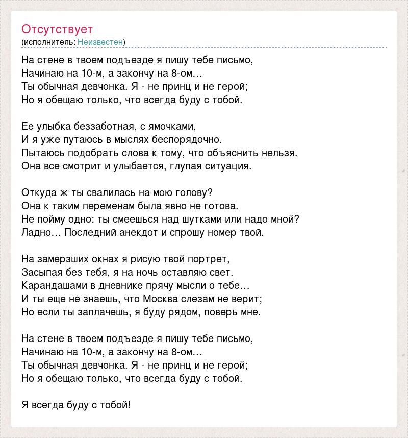 На стене в твоем подъезде я пишу тебе письмо, Начинаю на 10-м, а закончу на 8-ом… Ты обычная девчонка. Я - не принц и не герой; Но я обещаю только, что всегда буду с тобой. Ее улыбка беззаботная, с ямочками, И я уже путаюсь в мыслях беспорядочно. Пытаюсь подобрать слова к тому, что объяснить нельзя. Она все смотрит и улыбается, глупая ситуация. Откуда ж ты свалилась на мою голову? Она к таким переменам была явно не готова. Не пойму одно: ты смеешься над шутками или надо мной? Ладно… Последний анекдот и спрошу номер твой. На замерзших окнах я рисую твой портрет, Засыпая без тебя, я на ночь оставляю свет. Карандашами в дневнике прячу мысли о тебе… И ты еще не знаешь, что Москва слезам не верит; Но если ты заплачешь, я буду рядом, поверь мне. На стене в твоем подъезде я пишу тебе письмо, Начинаю на 10-м, а закончу на 8-ом… Ты обычная девчонка. Я - не принц и не герой; Но я обещаю только, что всегда буду с тобой. Я всегда буду с тобой!