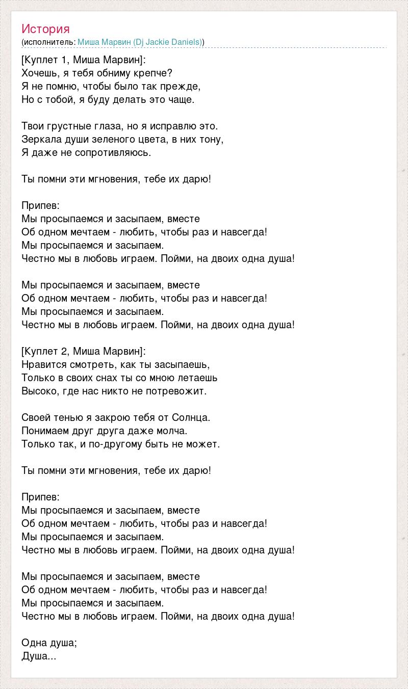 [Куплет 1, Миша Марвин]: Хочешь, я тебя обниму крепче? Я не помню, чтобы было так прежде, Но с тобой, я буду делать это чаще. Твои грустные глаза, но я исправлю это. Зеркала души зеленого цвета, в них тону, Я даже не сопротивляюсь. Ты помни эти мгновения, тебе их дарю! Припев: Мы просыпаемся и засыпаем, вместе Об одном мечтаем - любить, чтобы раз и навсегда! Мы просыпаемся и засыпаем. Честно мы в любовь играем. Пойми, на двоих одна душа! Мы просыпаемся и засыпаем, вместе Об одном мечтаем - любить, чтобы раз и навсегда! Мы просыпаемся и засыпаем. Честно мы в любовь играем. Пойми, на двоих одна душа! [Куплет 2, Миша Марвин]: Нравится смотреть, как ты засыпаешь, Только в своих снах ты со мною летаешь Высоко, где нас никто не потревожит. Своей тенью я закрою тебя от Солнца. Понимаем друг друга даже молча. Только так, и по-другому быть не может. Ты помни эти мгновения, тебе их дарю! Припев: Мы просыпаемся и засыпаем, вместе Об одном мечтаем - любить, чтобы раз и навсегда! Мы просыпаемся и засыпаем. Честно мы в любовь играем. Пойми, на двоих одна душа! Мы просыпаемся и засыпаем, вместе Об одном мечтаем - любить, чтобы раз и навсегда! Мы просыпаемся и засыпаем. Честно мы в любовь играем. Пойми, на двоих одна душа! Одна душа; Душа...