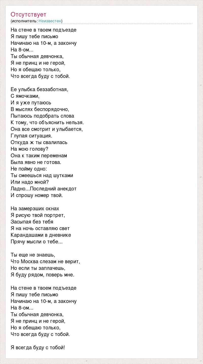 На стене в твоем подъезде Я пишу тебе письмо Начинаю на 10-м, а закончу На 8-ом... Ты обычная девчонка, Я не принц и не герой, Но я обещаю только, Что всегда буду с тобой. Ее улыбка беззаботная, С ямочками, И я уже путаюсь В мыслях беспорядочно, Пытаюсь подобрать слова К тому, что объяснить нельзя. Она все смотрит и улыбается, Глупая ситуация. Откуда ж ты свалилась На мою голову? Она к таким переменам Была явно не готова. Не пойму одно: Ты смеешься над шутками Или надо мной? Ладно...Последний анекдот И спрошу номер твой. На замерзших окнах Я рисую твой портрет, Засыпая без тебя Я на ночь оставляю свет Карандашами в дневнике Прячу мысли о тебе... Ты еще не знаешь, Что Москва слезам не верит, Но если ты заплачешь, Я буду рядом, поверь мне. На стене в твоем подъезде Я пишу тебе письмо Начинаю на 10-м, а закончу На 8-ом... Ты обычная девчонка, Я не принц и не герой, Но я обещаю только, Что всегда буду с тобой. Я всегда буду с тобой!