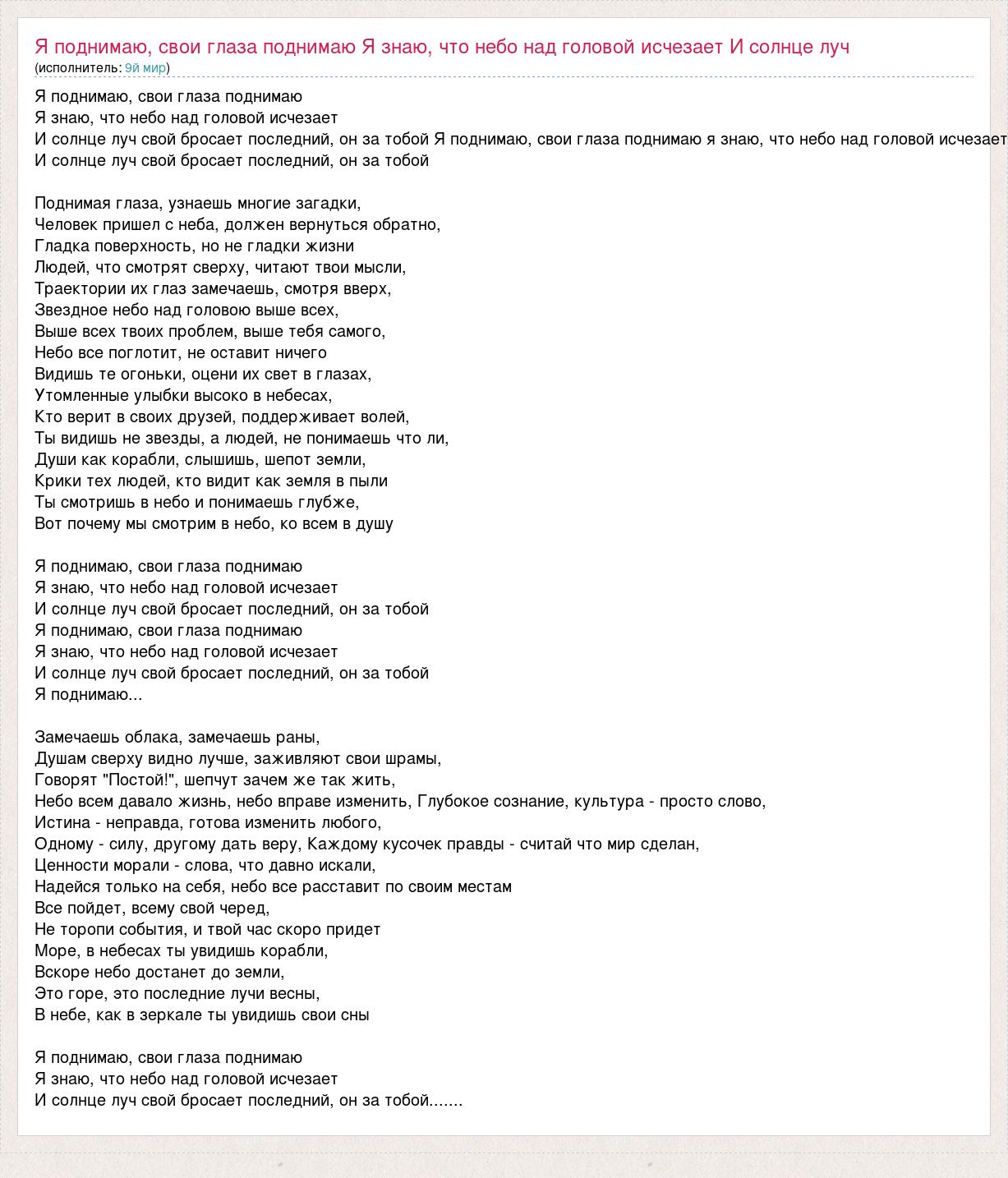 Я поднимаю, свои глаза поднимаю Я знаю, что небо над головой исчезает И солнце луч свой бросает последний, он за тобой Я поднимаю, свои глаза поднимаю я знаю, что небо над головой исчезает И солнце луч свой бросает последний, он за тобой Поднимая глаза, узнаешь многие загадки, Человек пришел с неба, должен вернуться обратно, Гладка поверхность, но не гладки жизни Людей, что смотрят сверху, читают твои мысли, Траектории их глаз замечаешь, смотря вверх, Звездное небо над головою выше всех, Выше всех твоих проблем, выше тебя самого, Небо все поглотит, не оставит ничего Видишь те огоньки, оцени их свет в глазах, Утомленные улыбки высоко в небесах, Кто верит в своих друзей, поддерживает волей, Ты видишь не звезды, а людей, не понимаешь что ли, Души как корабли, слышишь, шепот земли, Крики тех людей, кто видит как земля в пыли Ты смотришь в небо и понимаешь глубже, Вот почему мы смотрим в небо, ко всем в душу Я поднимаю, свои глаза поднимаю Я знаю, что небо над головой исчезает И солнце луч свой бросает последний, он за тобой Я поднимаю, свои глаза поднимаю Я знаю, что небо над головой исчезает И солнце луч свой бросает последний, он за тобой Я поднимаю... Замечаешь облака, замечаешь раны, Душам сверху видно лучше, заживляют свои шрамы, Говорят "Постой!", шепчут зачем же так жить, Небо всем давало жизнь, небо вправе изменить, Глубокое сознание, культура - просто слово, Истина - неправда, готова изменить любого, Одному - силу, другому дать веру, Каждому кусочек правды - считай что мир сделан, Ценности морали - слова, что давно искали, Надейся только на себя, небо все расставит по своим местам Все пойдет, всему свой черед, Не торопи события, и твой час скоро придет Море, в небесах ты увидишь корабли, Вскоре небо достанет до земли, Это горе, это последние лучи весны, В небе, как в зеркале ты увидишь свои сны Я поднимаю, свои глаза поднимаю Я знаю, что небо над головой исчезает И солнце луч свой бросает последний, он за тобой.......