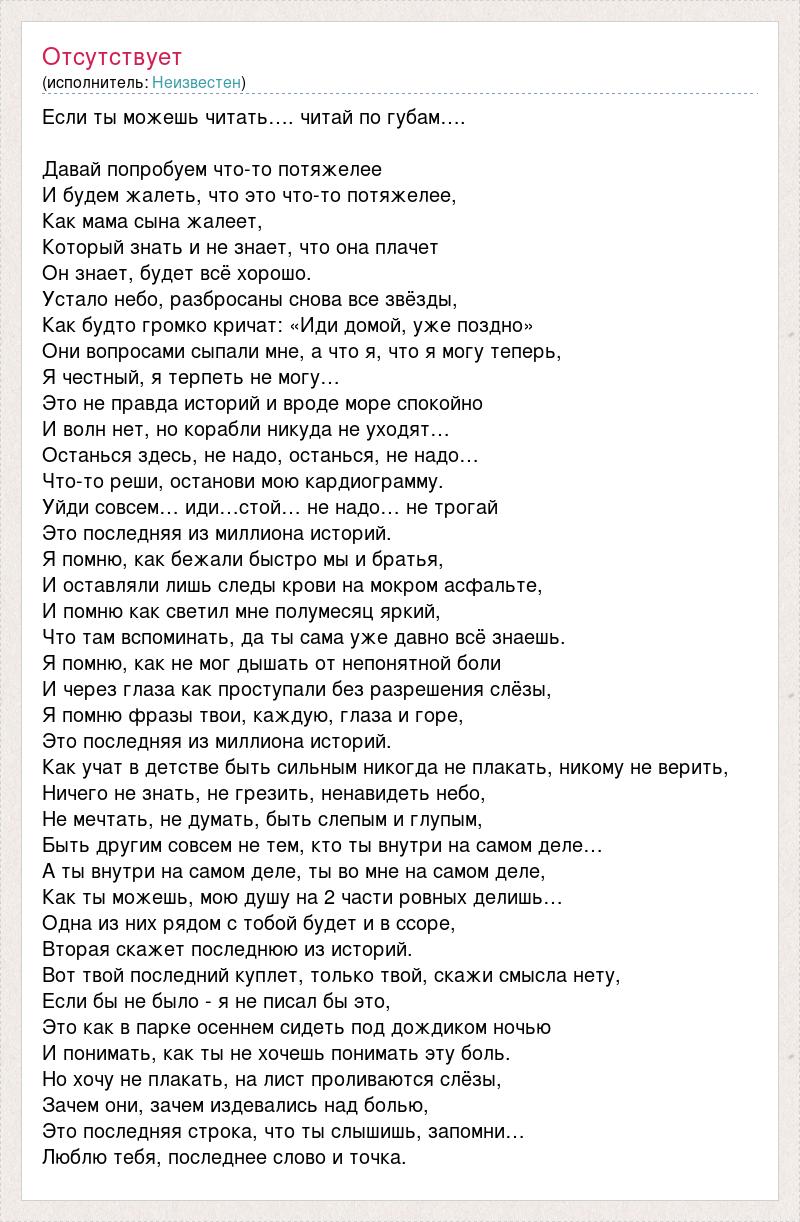 Если ты можешь читать…. читай по губам…. Давай попробуем что-то потяжелее И будем жалеть, что это что-то потяжелее, Как мама сына жалеет, Который знать и не знает, что она плачет Он знает, будет всё хорошо. Устало небо, разбросаны снова все звёзды, Как будто громко кричат: «Иди домой, уже поздно» Они вопросами сыпали мне, а что я, что я могу теперь, Я честный, я терпеть не могу… Это не правда историй и вроде море спокойно И волн нет, но корабли никуда не уходят… Останься здесь, не надо, останься, не надо… Что-то реши, останови мою кардиограмму. Уйди совсем… иди…стой… не надо… не трогай Это последняя из миллиона историй. Я помню, как бежали быстро мы и братья, И оставляли лишь следы крови на мокром асфальте, И помню как светил мне полумесяц яркий, Что там вспоминать, да ты сама уже давно всё знаешь. Я помню, как не мог дышать от непонятной боли И через глаза как проступали без разрешения слёзы, Я помню фразы твои, каждую, глаза и горе, Это последняя из миллиона историй. Как учат в детстве быть сильным никогда не плакать, никому не верить, Ничего не знать, не грезить, ненавидеть небо, Не мечтать, не думать, быть слепым и глупым, Быть другим совсем не тем, кто ты внутри на самом деле… А ты внутри на самом деле, ты во мне на самом деле, Как ты можешь, мою душу на 2 части ровных делишь… Одна из них рядом с тобой будет и в ссоре, Вторая скажет последнюю из историй. Вот твой последний куплет, только твой, скажи смысла нету, Если бы не было - я не писал бы это, Это как в парке осеннем сидеть под дождиком ночью И понимать, как ты не хочешь понимать эту боль. Но хочу не плакать, на лист проливаются слёзы, Зачем они, зачем издевались над болью, Это последняя строка, что ты слышишь, запомни… Люблю тебя, последнее слово и точка.