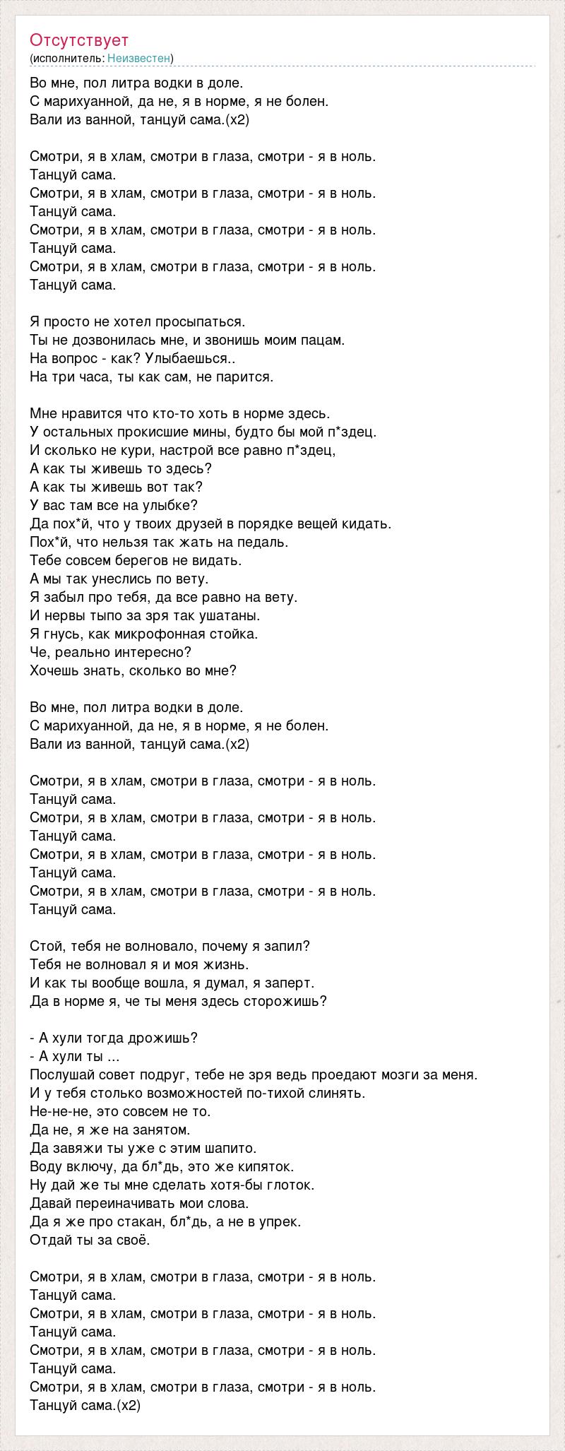 Во мне, пол литра водки в доле. С марихуанной, да не, я в норме, я не болен. Вали из ванной, танцуй сама.(х2) Смотри, я в хлам, смотри в глаза, смотри - я в ноль. Танцуй сама. Смотри, я в хлам, смотри в глаза, смотри - я в ноль. Танцуй сама. Смотри, я в хлам, смотри в глаза, смотри - я в ноль. Танцуй сама. Смотри, я в хлам, смотри в глаза, смотри - я в ноль. Танцуй сама. Я просто не хотел просыпаться. Ты не дозвонилась мне, и звонишь моим пацам. На вопрос - как? Улыбаешься.. На три часа, ты как сам, не парится. Мне нравится что кто-то хоть в норме здесь. У остальных прокисшие мины, будто бы мой п*здец. И сколько не кури, настрой все равно п*здец, А как ты живешь то здесь? А как ты живешь вот так? У вас там все на улыбке? Да пох*й, что у твоих друзей в порядке вещей кидать. Пох*й, что нельзя так жать на педаль. Тебе совсем берегов не видать. А мы так унеслись по вету. Я забыл про тебя, да все равно на вету. И нервы тыпо за зря так ушатаны. Я гнусь, как микрофонная стойка. Че, реально интересно? Хочешь знать, сколько во мне? Во мне, пол литра водки в доле. С марихуанной, да не, я в норме, я не болен. Вали из ванной, танцуй сама.(х2) Смотри, я в хлам, смотри в глаза, смотри - я в ноль. Танцуй сама. Смотри, я в хлам, смотри в глаза, смотри - я в ноль. Танцуй сама. Смотри, я в хлам, смотри в глаза, смотри - я в ноль. Танцуй сама. Смотри, я в хлам, смотри в глаза, смотри - я в ноль. Танцуй сама. Стой, тебя не волновало, почему я запил? Тебя не волновал я и моя жизнь. И как ты вообще вошла, я думал, я заперт. Да в норме я, че ты меня здесь сторожишь? - А хули тогда дрожишь? - А хули ты ... Послушай совет подруг, тебе не зря ведь проедают мозги за меня. И у тебя столько возможностей по-тихой слинять. Не-не-не, это совсем не то. Да не, я же на занятом. Да завяжи ты уже с этим шапито. Воду включу, да бл*дь, это же кипяток. Ну дай же ты мне сделать хотя-бы глоток. Давай переиначивать мои слова. Да я же про стакан, бл*дь, а не в упрек. Отдай ты за своё. Смотри, я в хлам, смотри в глаза, смотри - я в ноль. Танцуй сама. Смотри, я в хлам, смотри в глаза, смотри - я в ноль. Танцуй сама. Смотри, я в хлам, смотри в глаза, смотри - я в ноль. Танцуй сама. Смотри, я в хлам, смотри в глаза, смотри - я в ноль. Танцуй сама.(х2)