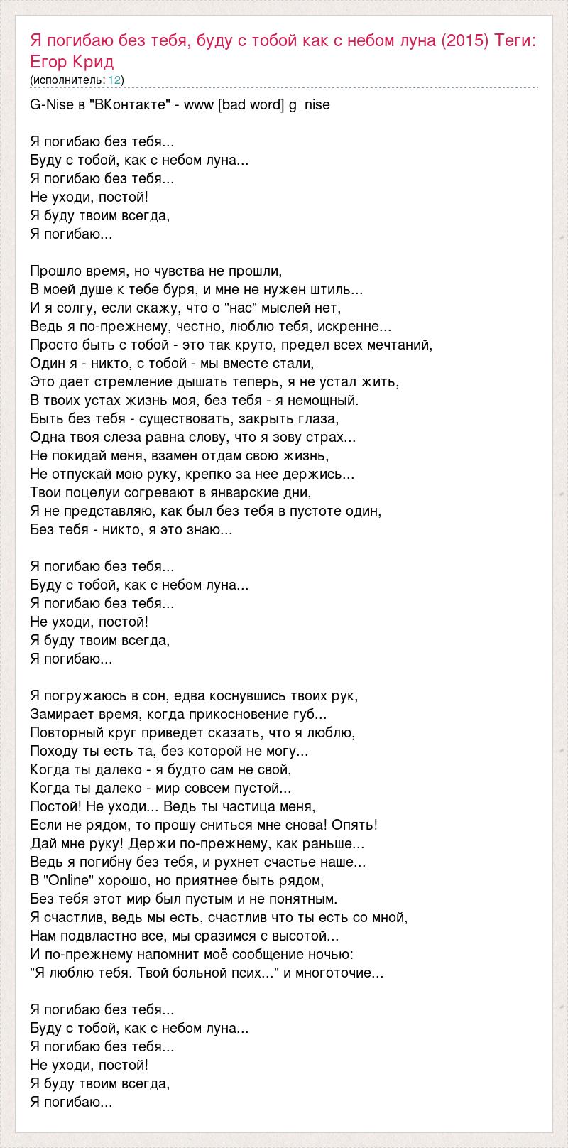 G-Nise в "ВКонтакте" - www [bad word] g_nise Я погибаю без тебя... Буду с тобой, как с небом луна... Я погибаю без тебя... Не уходи, постой! Я буду твоим всегда, Я погибаю... Прошло время, но чувства не прошли, В моей душе к тебе буря, и мне не нужен штиль... И я солгу, если скажу, что о "нас" мыслей нет, Ведь я по-прежнему, честно, люблю тебя, искренне... Просто быть с тобой - это так круто, предел всех мечтаний, Один я - никто, с тобой - мы вместе стали, Это дает стремление дышать теперь, я не устал жить, В твоих устах жизнь моя, без тебя - я немощный. Быть без тебя - существовать, закрыть глаза, Одна твоя слеза равна слову, что я зову страх... Не покидай меня, взамен отдам свою жизнь, Не отпускай мою руку, крепко за нее держись... Твои поцелуи согревают в январские дни, Я не представляю, как был без тебя в пустоте один, Без тебя - никто, я это знаю... Я погибаю без тебя... Буду с тобой, как с небом луна... Я погибаю без тебя... Не уходи, постой! Я буду твоим всегда, Я погибаю... Я погружаюсь в сон, едва коснувшись твоих рук, Замирает время, когда прикосновение губ... Повторный круг приведет сказать, что я люблю, Походу ты есть та, без которой не могу... Когда ты далеко - я будто сам не свой, Когда ты далеко - мир совсем пустой... Постой! Не уходи... Ведь ты частица меня, Если не рядом, то прошу сниться мне снова! Опять! Дай мне руку! Держи по-прежнему, как раньше... Ведь я погибну без тебя, и рухнет счастье наше... В "Online" хорошо, но приятнее быть рядом, Без тебя этот мир был пустым и не понятным. Я счастлив, ведь мы есть, счастлив что ты есть со мной, Нам подвластно все, мы сразимся с высотой... И по-прежнему напомнит моё сообщение ночью: "Я люблю тебя. Твой больной псих..." и многоточие... Я погибаю без тебя... Буду с тобой, как с небом луна... Я погибаю без тебя... Не уходи, постой! Я буду твоим всегда, Я погибаю...